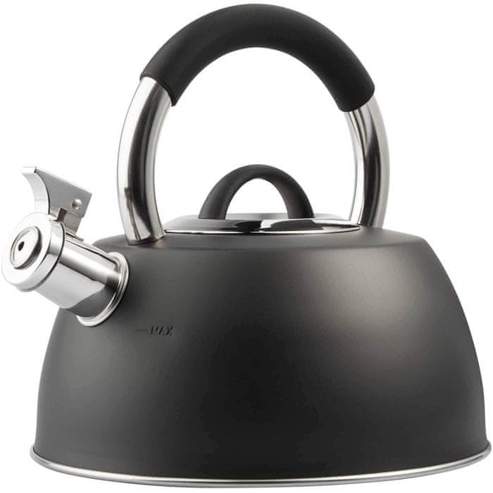 Satenasto črna kuhalnica iz nerjavečega jekla, 2,2L, z ergonomskim ročajem in odpornostjo proti koroziji. Primerna za vse vrste kuhalnih plošč. Celoten opis