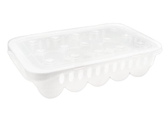 Kvalitetna plastična škatla za 15 jajc 100 % brez BPA. Zapiranje s sponko. Primerno za pomivanje v pomivalnem stroju. EAN 5902738218045