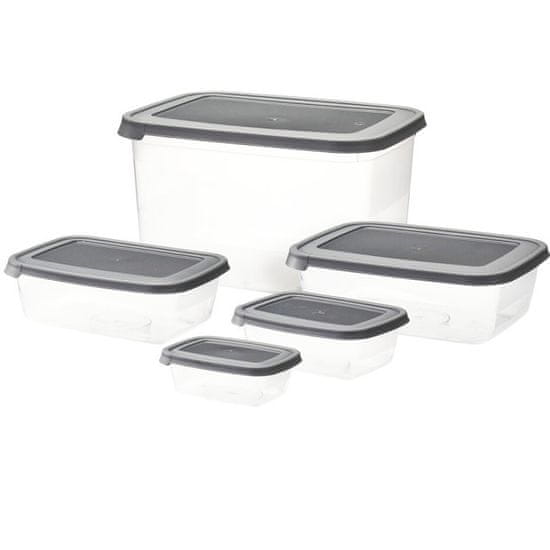 Praktičen set škatel za shranjevanje s pokrovi v elegantnem svetlo sivem odtenku. Idealne za shranjevanje hrane, drobnarij ali za organizacijo gospodinjstva. Škatle se razlikujejo po velikosti, zato ponujajo širok spekter uporabe v kuhinji in zunaj nje.