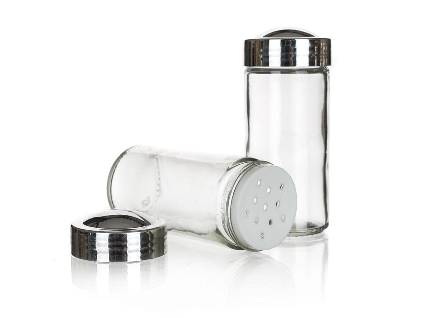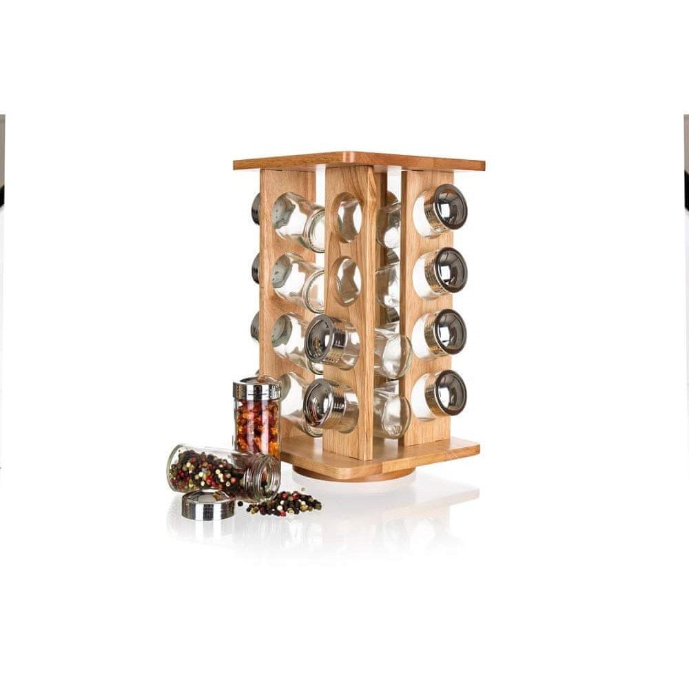 Set začimb Brillante vsebuje: 16 x stekleni kozarec s plastičnim pokrovom in kromiranim zaključkom 1 x vrtljivo leseno stojalo z merami 16,5 × 16,5 × 30,3 cm