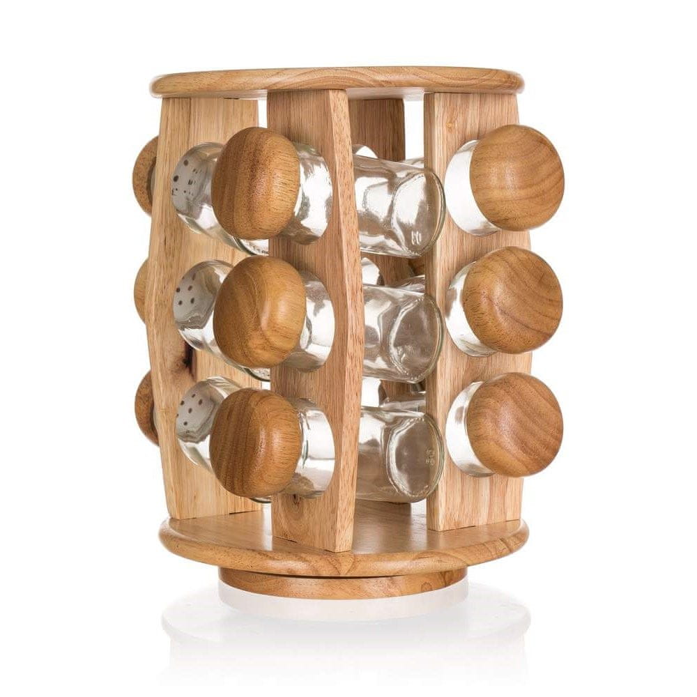 12-delni set začimb Brillante vsebuje: 12× steklene začimbe z lesenimi pokrovčki iz lesa kavčukovca, 1× vrtljiv lesen podstavek 19,8 × 19,8 × 24,1 cm. Celoten opis