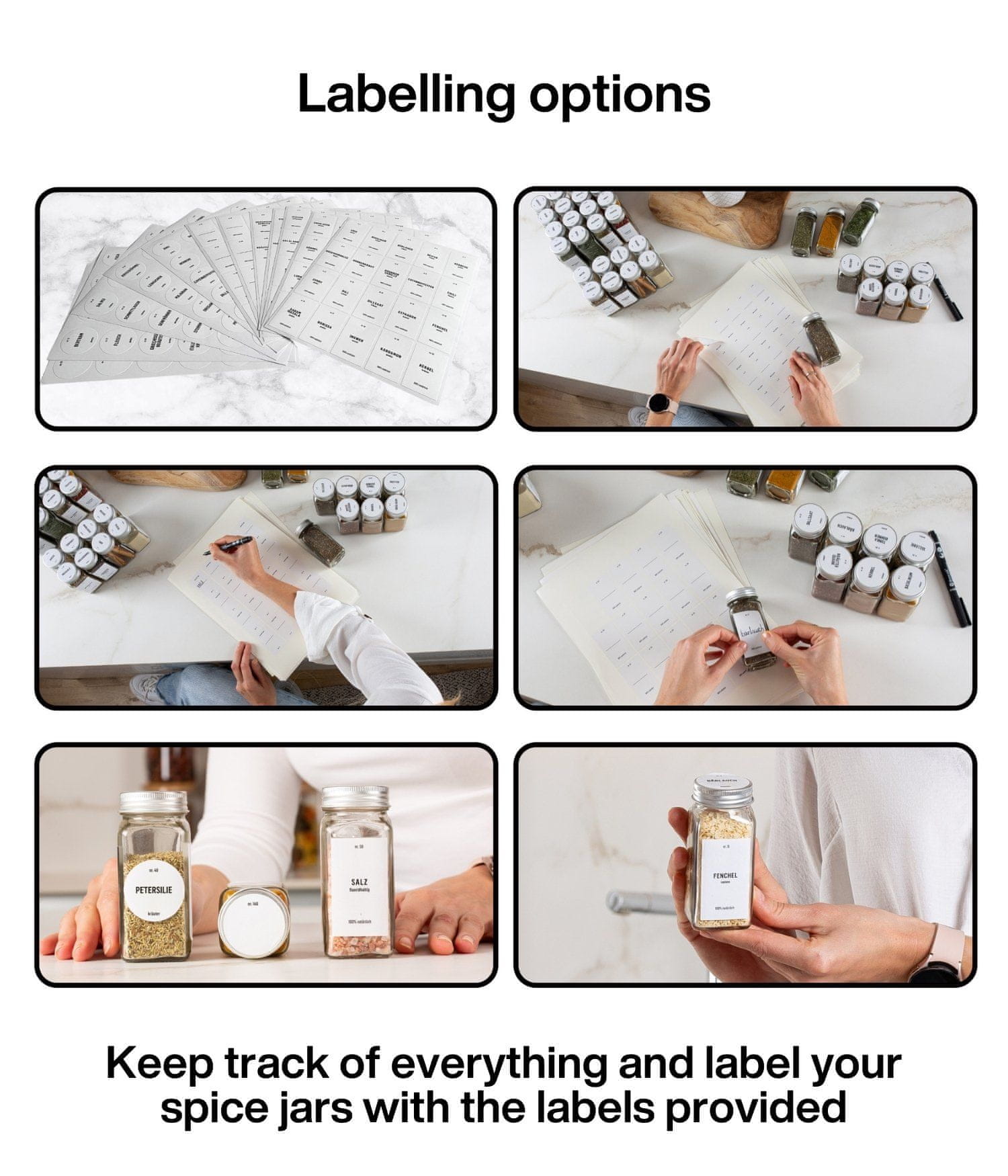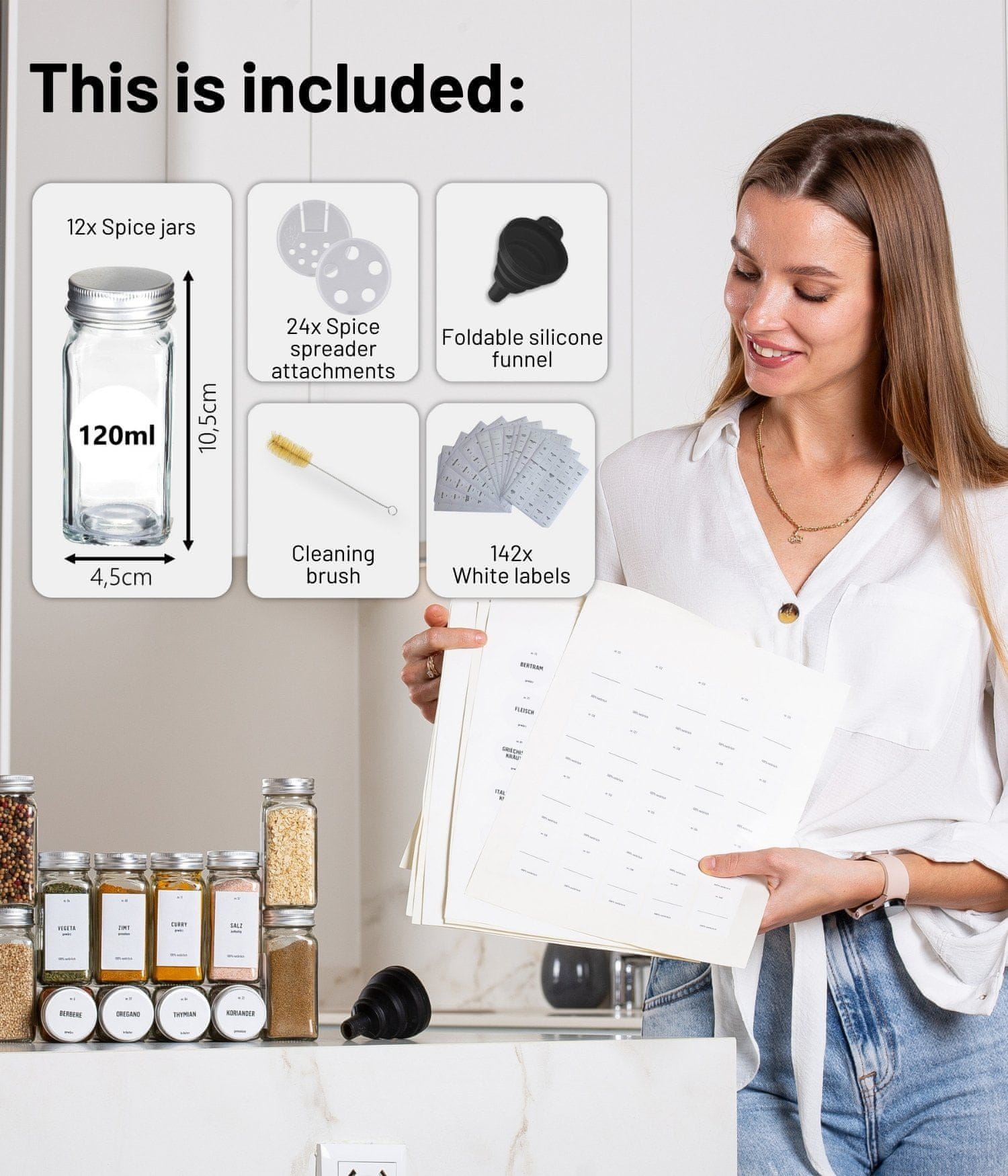 Ne dobite le 12 odličnih kozarčkov za začimbe, ampak celoten komplet, v katerem boste našli vse, kar potrebujete. Vključenih je 48 prednatisnjenih okroglih nalepk z imeni začimb v nemščini, 48 prednatisnjenih pravokotnih nalepk z imeni začimb v nemščini, 24 praznih okroglih nalepk in 22 praznih pravokotnih nalepk.