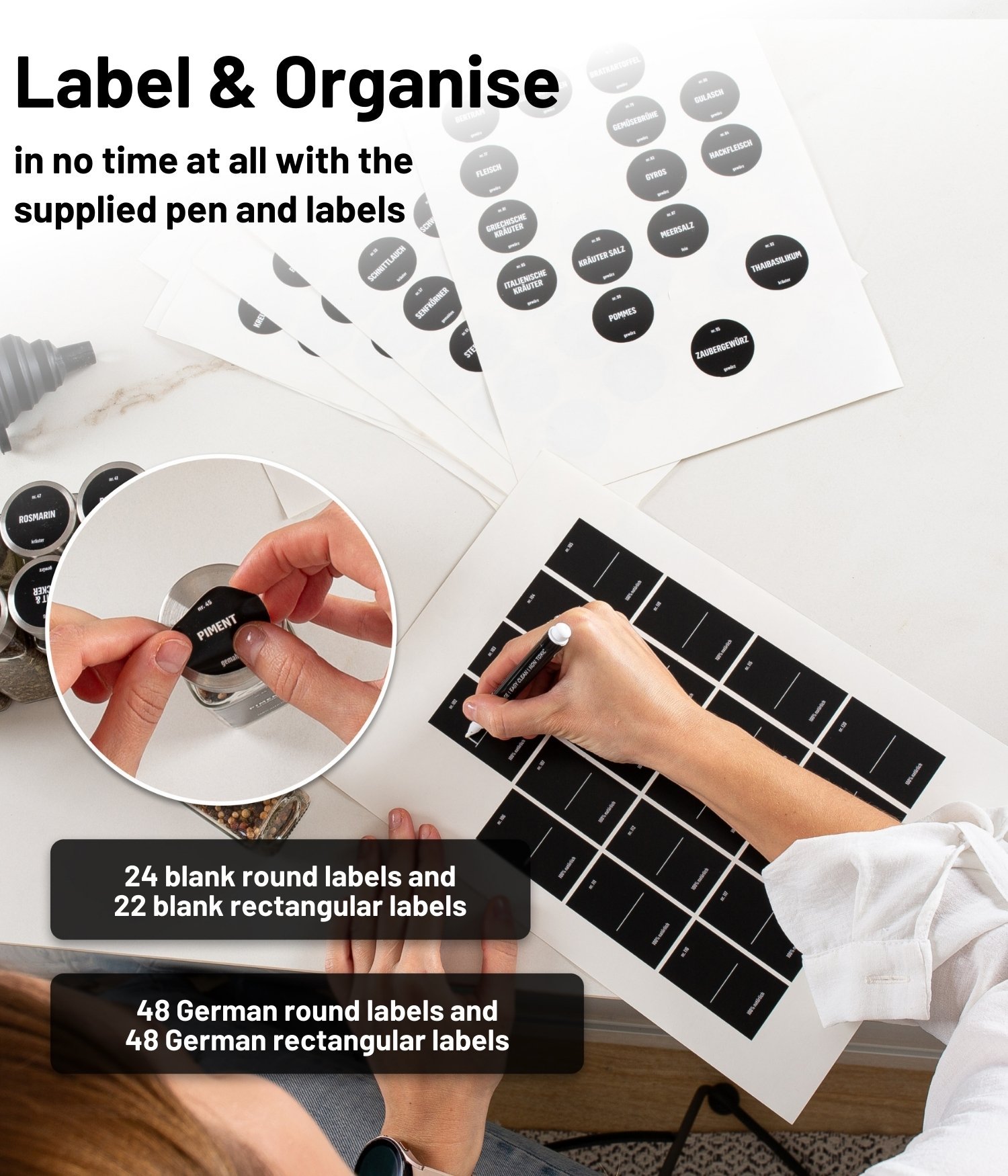 Ne dobite le 12 odličnih kozarčkov za začimbe, ampak celoten komplet, v katerem boste našli vse, kar potrebujete. Vključenih je 48 prednatisnjenih okroglih nalepk z imeni začimb v nemščini, 48 prednatisnjenih pravokotnih nalepk z imeni začimb v nemščini, 24 praznih okroglih nalepk in 22 praznih pravokotnih nalepk na katere lahko pišete s priloženim visokokakovostnim krednim pisalom.