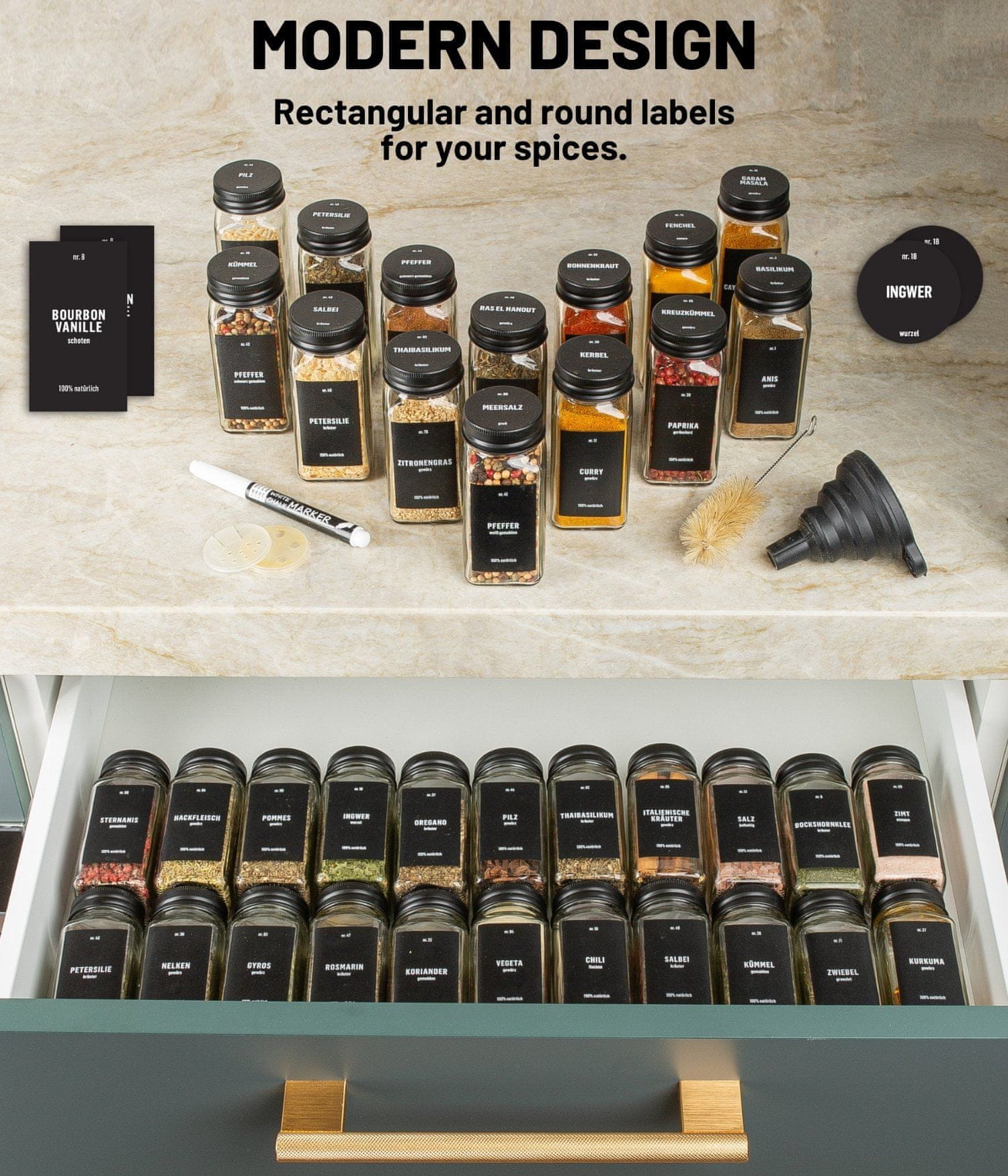 - OZNAČITE SVOJE ZAČIMBE KOT PROFESIONALEC! – Komplet kozarčkov za začimbe s pokrovčki vključuje tudi 200 nalepk v nemščini z natisnjenimi imeni najpogostejših začimb in 80 praznih nalepk, na katere lahko pišete s priloženim krednim pisalom.