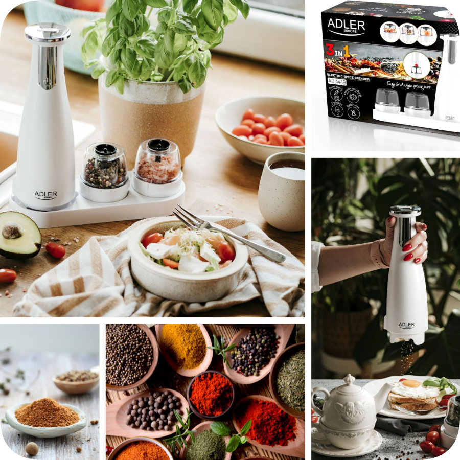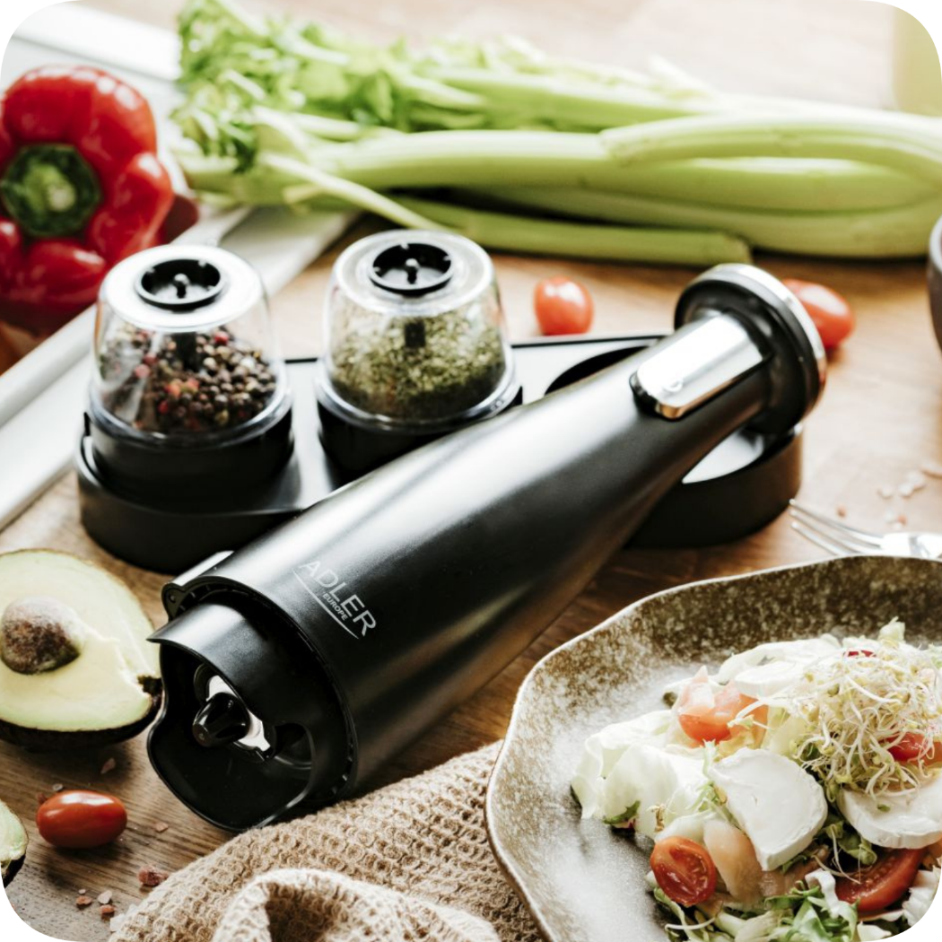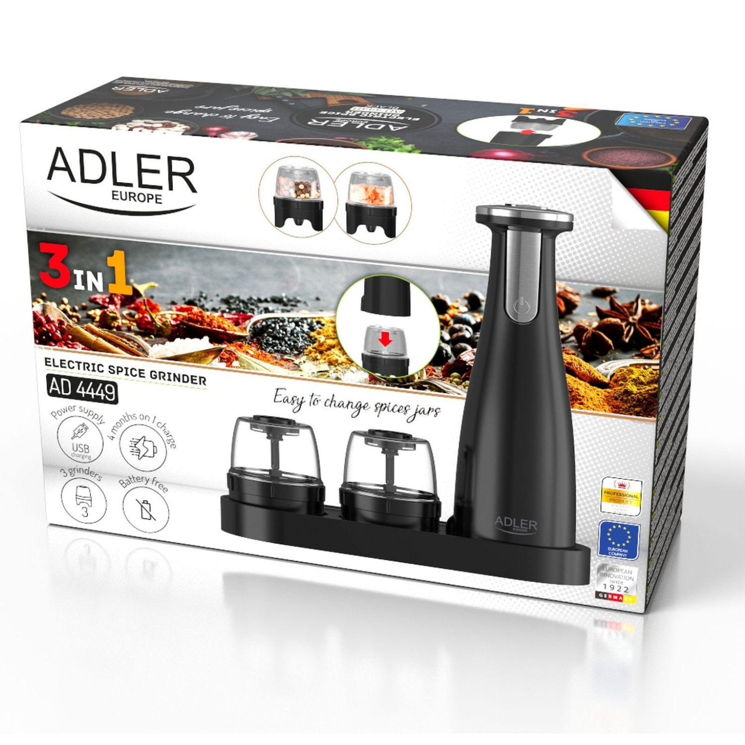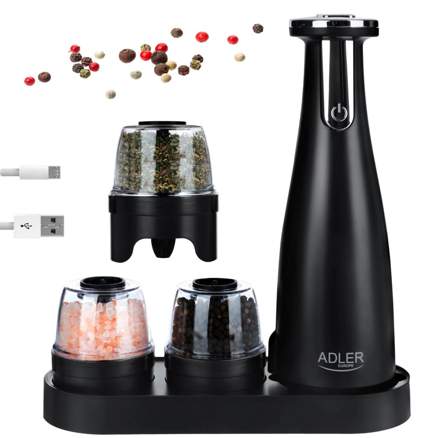 Profesionalni Komplet 3 ADLER mlinčkov za začimbe, sol in poper, polnjenje preko USB-ja. Mlinčki s keramičnimi rezili. Prostornina enega mlinčka je 150 ml . Napravo polnite s priloženim kablom USB. Priročna rešitev za vsakega kuharskega navdušenca.