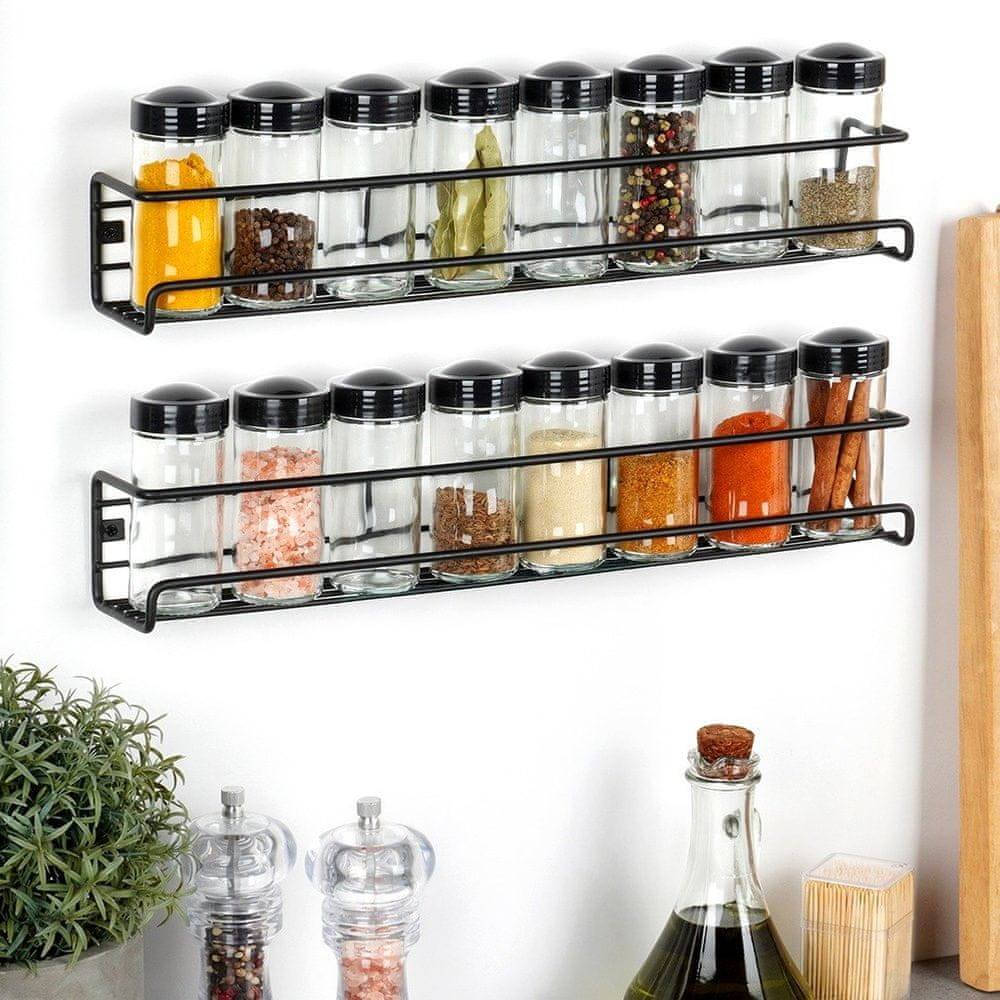 Komplet dveh univerzalnih polic za začimbe s posodicami za začimbe. So idealen prostor za pridobitev dodatnega prostora za shranjevanje. Okrašene v modnih barvah bodo dopolnile vsako notranjost. Police lahko postavite na pult ali obesite na steno. Izdelano v skladu z evropskimi standardi.