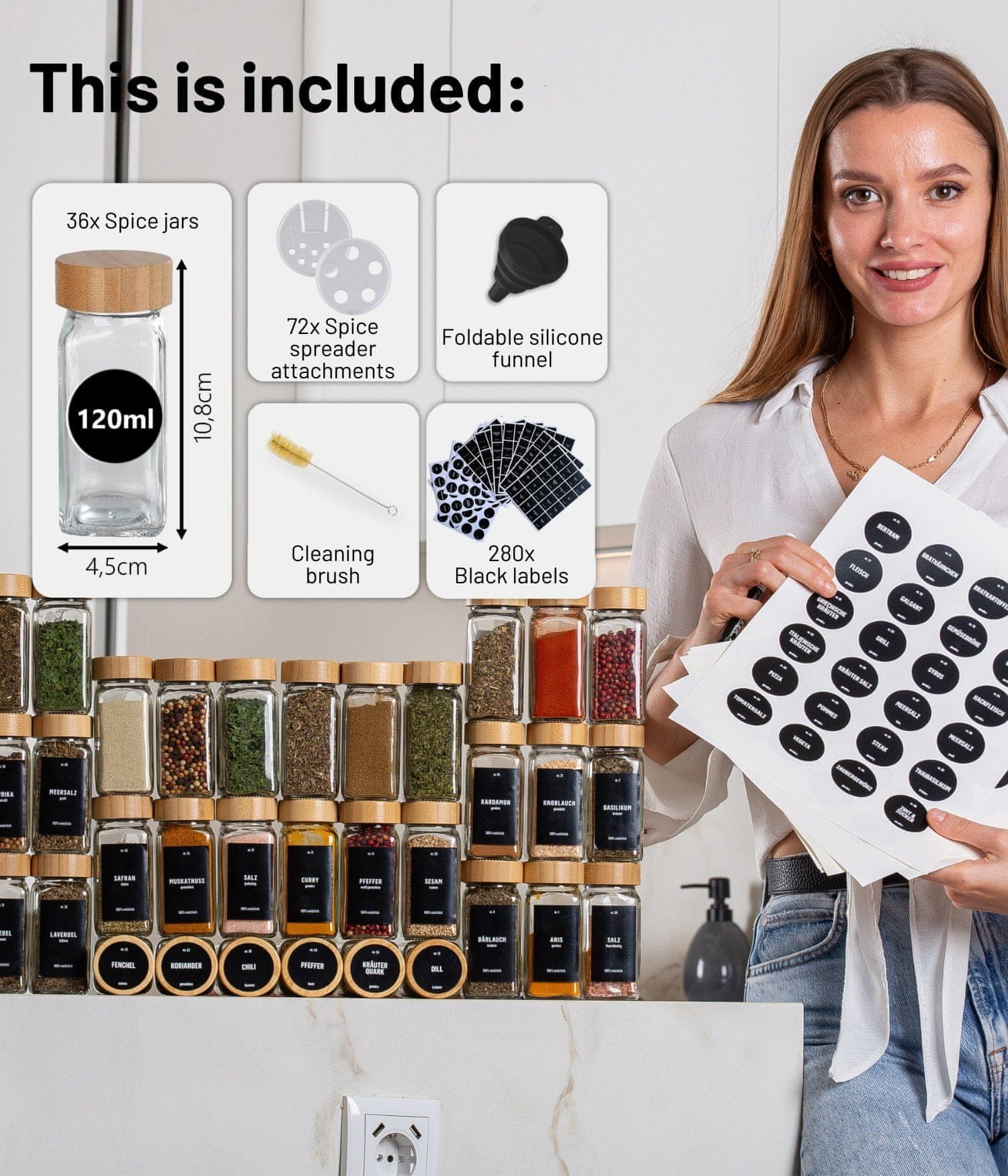 Ne dobite le 36 odličnih kozarčkov za začimbe, ampak celoten komplet, v katerem boste našli vse, kar potrebujete. Vključenih je 48 prednatisnjenih okroglih nalepk z imeni začimb v nemščini, 48 prednatisnjenih okroglih nalepk z imeni začimb v francoščini in 48 praznih okroglih nalepk, na katere lahko pišete s priloženim visokokakovostnim krednim pisalom.