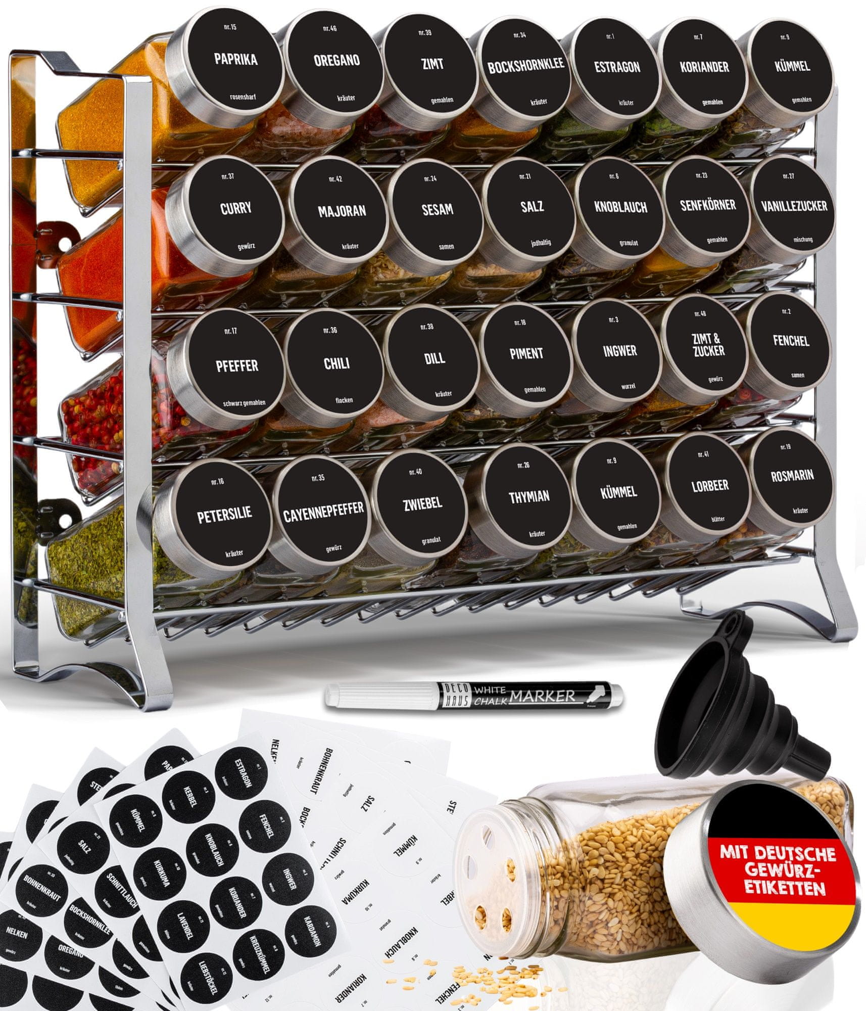Deco Haus Stojalo za začimbe s kozarčki za začimbe Deco Haus – 4-nivojsko kovinsko stojalo – Kuhinjski organizator, Stojalo za začimbe s 28 kozarčki, 144 nalepkami, krtačko, lijakom, kaveljčki, Nerjaveče jeklo