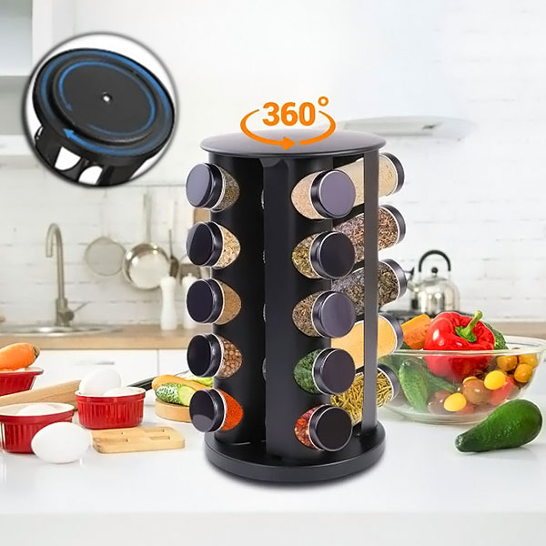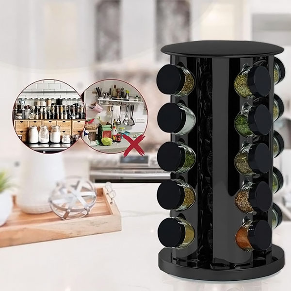 To vrtljivo stojalo za začimbe prinaša funkcionalnost in slog v vsako kuhinjo.