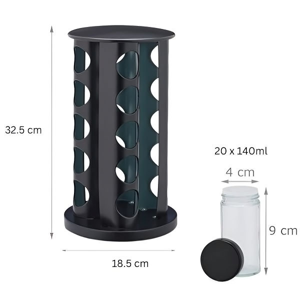HOME & MARKER® Vrtljivi organizator za začimbe 360° z 20 steklenimi kozarci, črn, 32,5x18,5 cm | SPINSPICE