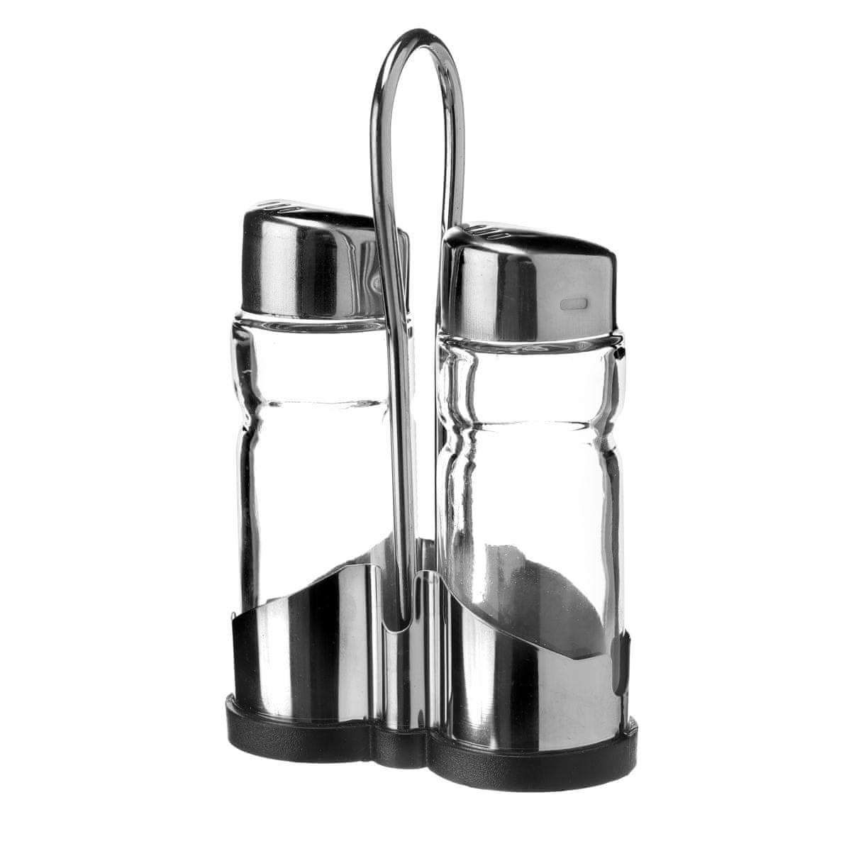 Set začimb FABIO (2 kosa) je praktičen komplet dveh solnic in poprovnic s stojalom. Vsak ima prostornino 40 ml in je izdelan iz prozornega stekla, stojalo je iz nerjavečega jekla. Začimbe Fabio ne bodo samo praktičen pomočnik, temveč predvsem lep oblikovalski element v kuhinji. Velikost seta začimb je (ŠxGxV): 7,8×3,8×12,5 cm.