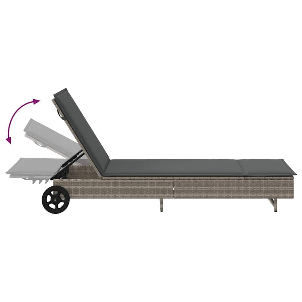 Vidaxl Vrtni ležalnik s kolesi in blazino siv poli ratan
