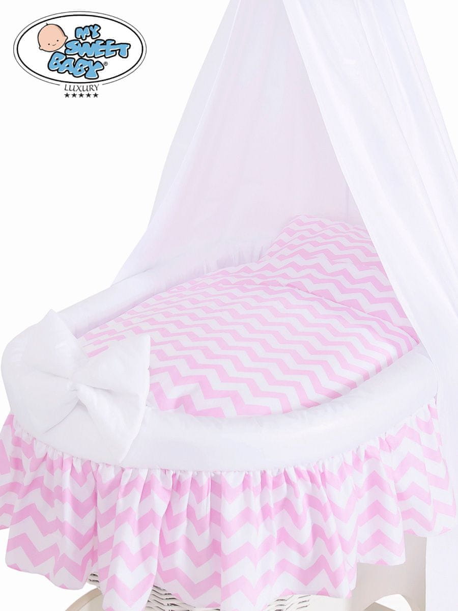 Krasna ročno pletena pletena košara z originalnim velikim lesenim podvozjem. Bela barva protja in lesa. V kompletu z obrobo in posteljnino iz belega in rožnatega bombaža v modnem cikcak šivronu.Dojenčka košara za spanje iz protja priznanega MY SWEET BABY luksuznega vodilnega evropskega proizvajalca takšnih košar. Vrhunska kakovost, tkanine s certifikatom Okotex in TUV. Največja velikost na trgu – omogoča daljšo uporabo (od rojstva do približno 9 mesecev otrokove starosti). Celotne mere: D 95 cm, B 62–63 cm, V 145 cm. Dimenzije ležišča: 80×45 cm.  – leseno podvozje v beli barvi s 4 velikimi lesenimi kolesi, – leseno podvozje v beli barvi s 4 velikimi lesenimi kolesi. – prevleka košare iz 100 % odobrenega bombaža, podložena z debelo plastjo mehkega silikoniziranega flisa, – okvir- baldahin – komplet polnil: vzglavnik (33×36 cm) in odeja (75×65 cm) (ni mogoče odstraniti), – PREMIUM mattress (approx. debeline 4 cm)-  iz debelega stisnjenega netkanega materiala, ki je vzmeten, antialergijski in diha. Z lahkim prešitim pokrivalom, ki ga je mogoče enostavno odstraniti za pranje, zapenja se s pokrito zadrgo; .