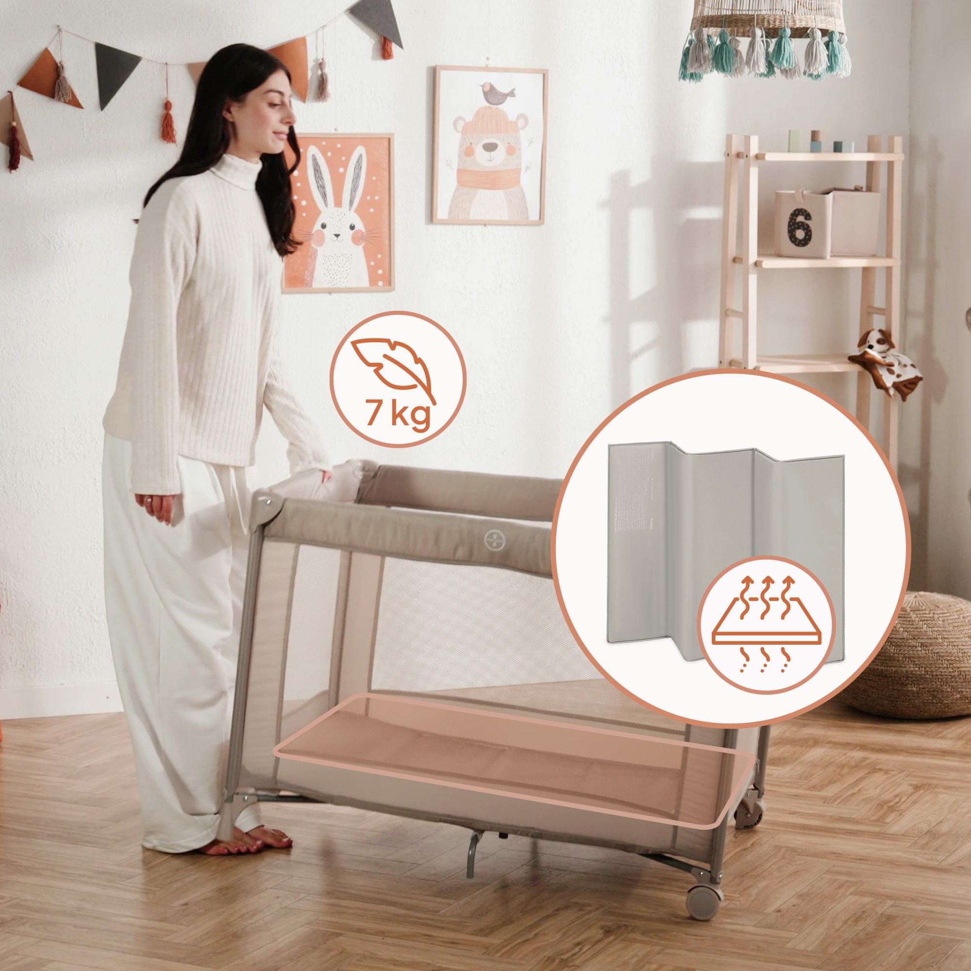 Prenosna posteljica Lionelo Amelie otroku zagotavlja varen prostor za počitek in zabavo, kjer koli ste. Zaradi svoje kompaktne zasnove je idealna izbira za manjše prostore, hkrati pa omogoča preprosto prenašanje na potovanja. Priložena vzmetnica debeline 2 cm s peno T25 nudi ustrezno podporo hrbtenici in zagotavlja udoben počitek vašemu malčku.