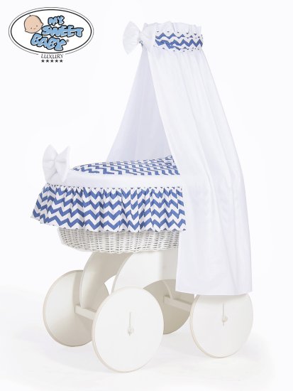Krasna ročno pletena pletena košara z originalnim velikim lesenim podvozjem. Bela barva protja in lesa. V kompletu z oglavjem za baldahin in posteljnino iz belega in mornarskega bombaža v modnem cikcaku v obliki šivana. iz protja, ki jo izdeluje priznani MY SWEET BABY luksuzni vodilni evropski proizvajalec takšnih košar. Vrhunska kakovost, tkanine s certifikatom Okotex in TUV. Največja velikost na trgu – omogoča daljšo uporabo (od rojstva do približno 9 mesecev otrokove starosti). Celotne mere: D 95 cm, B 62–63 cm, V 145 cm. Dimenzije ležišča: 80×45 cm. – natural-coloured wicker basket, – natural-coloured wooden undercarriage with 4 large wooden wheels, – wooden undercarriage with 4 large wooden wheels. – prevleka košare iz 100 % odobrenega bombaža, podložena z debelo plastjo mehkega silikoniziranega flisa, – okvir- baldahin – komplet polnil: vzglavnik (33×36 cm) in odeja (75×65 cm) (ni mogoče odstraniti), – PREMIUM mattress (approx. debeline 4 cm)- iz debelega stisnjenega netkanega materiala, ki je vzmeten, antialergijski in diha. Z lahkim prešitim pokrivalom, ki ga je mogoče enostavno odstraniti za pranje, zapenja se s pokrito zadrgo; .