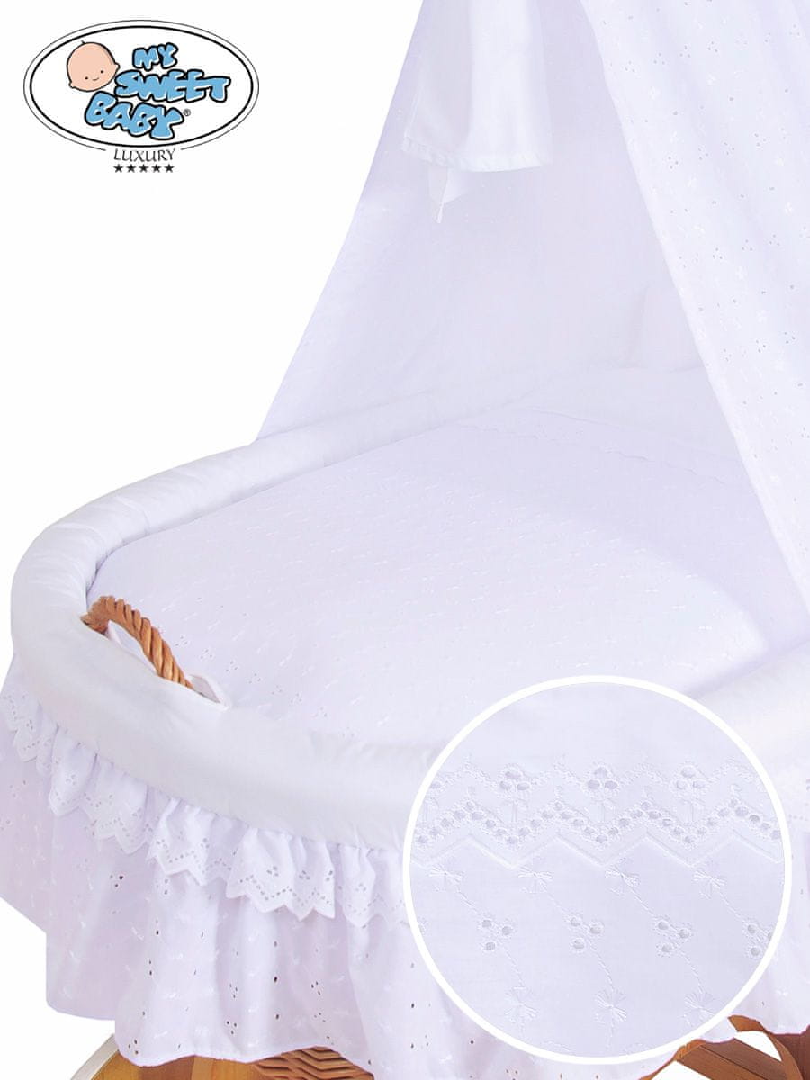 Krasna ročno pletena pletena košara z originalno veliko leseno šasijo. Naravna barva protja in lesa. V kompletu z obrobo in posteljnino iz bombaža z belo vezeno čipko.Dojeniška košara za spanje iz protja priznanega podjetja MY SWEET BABY, vodilnega evropskega proizvajalca takšnih košar. Vrhunska kakovost, tkanine s certifikatom Okotex in TUV. Odlično za majhna stanovanja in tudi domove. Velika kolesa omogočajo enostavno premikanje košare. S tem zagotovite, da bo vaš otrok vedno ob vas. Lahko tudi udobno spi na balkonu ali na vrtu – v košari je veliko več prostora kot v prenosnem ležišču otroškega vozička. Največje mere na trgu – omogočajo daljšo uporabo (od rojstva do približno 9 mesecev starosti). . Skupne mere: D 95 cm, B 62–63 cm, V 145 cm. Dimenzije ležišča: 80×45 cm. Vključuje: – pletena košara naravne barve, – leseno podvozje naravne barve, s 4 lesenimi kolesi z belimi pnevmatikami um, .br /> – obroba košare iz 100-odstotnega bombaža podložena z debelo plastjo mehkega silikoniziranega flisa, – baldahin + lok, – komplet polnil: vzglavnik (35×37 cm) in odeja (78×78 cm), – prevleka za vzglavnik (35×37 cm) in prevleka za odejo (78×78 cm), - Vzmetnica PREMIUM (pribl. debeline 4 cm)- izdelana iz debelega stisnjenega netkanega materiala, ki je vzmeten, antialergijski in diha. Z lahkim prešitim pokrovom, ki ga je mogoče enostavno odstraniti za pranje, zapenja se s pokrito zadrgo; .