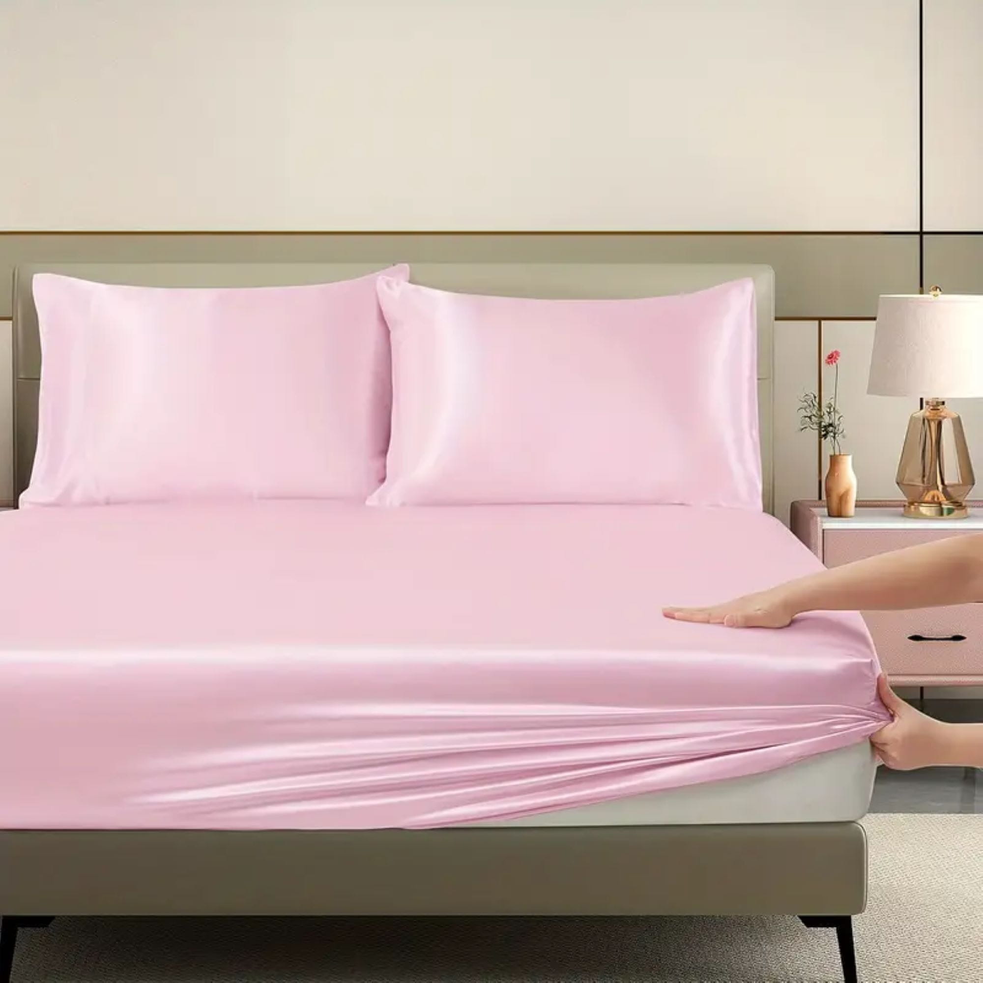 HOME & MARKER® Napenjalna rjuha, Gladka rjuha, Imitacija svile, Odporna na vlago, 1x prilegajoča se rjuha + 2x prevleka za vzglavnik (Roza, 150 x 200) | SILKYFIT
