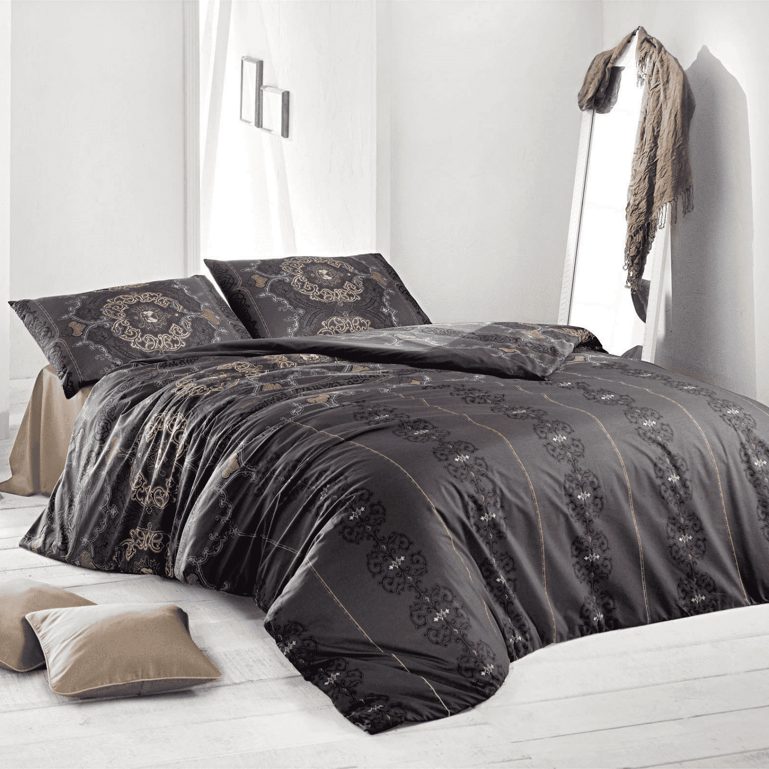 Bombažna posteljnina AZURA po navdihu vzhodnih motivov. Kombinacija plemenite temno sive barve in zlato rumenega ornamenta se bo odlično podala k notranjosti vaše spalnice. Ta udobna posteljnina iz mehkega bombaža. Je ena izmed najboljših izbir za ljubitelje lepih sanj in udobnega spanca.