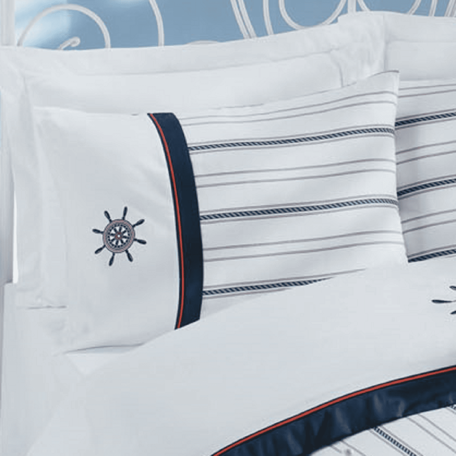 Temno modri poudarki na bleščeče beli osnovi ustvarjajo svež in zračen videz, popoln za ljubitelje morskega sloga. Hrbtna stran prevleke za odejo je iz gladkega, enobarvnega bombažnega satena, ki nudi čist občutek udobja.