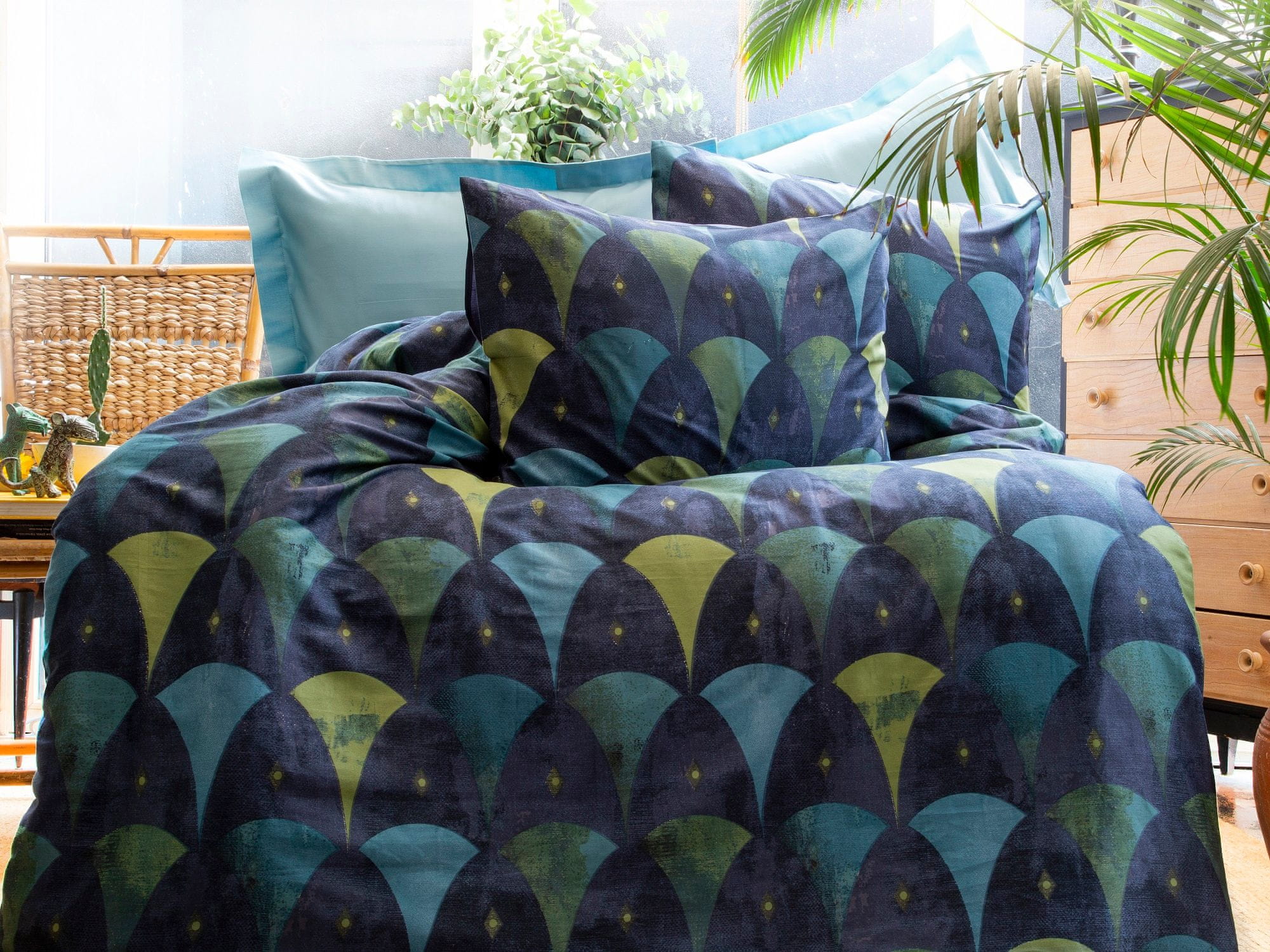 Odkrijte našo bombažno satenasto posteljnino GOLDEN STAMP. Ta komplet je bil ustvarjen, da povzdigne vašo spalnico s pridihom ekskluzivnosti. Elementi grafičnega oblikovanja in živahne barve na temno modri podlagi ustvarjajo prav posebno čudovito vzdušje z nekaj luksuznega pridiha.