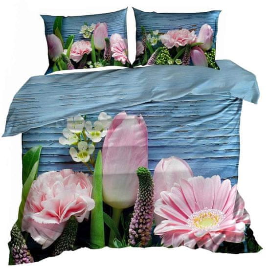 Posteljnina s prikazom šopka svetlo rožnatih rož na modrem ozadju.