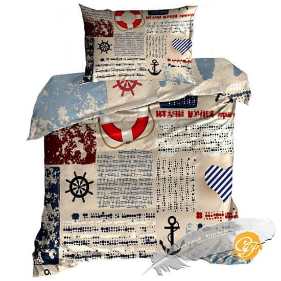 Bež posteljnina z motivi krmil, sider, rešilnih pasov, navtičnih src in nizov pik.