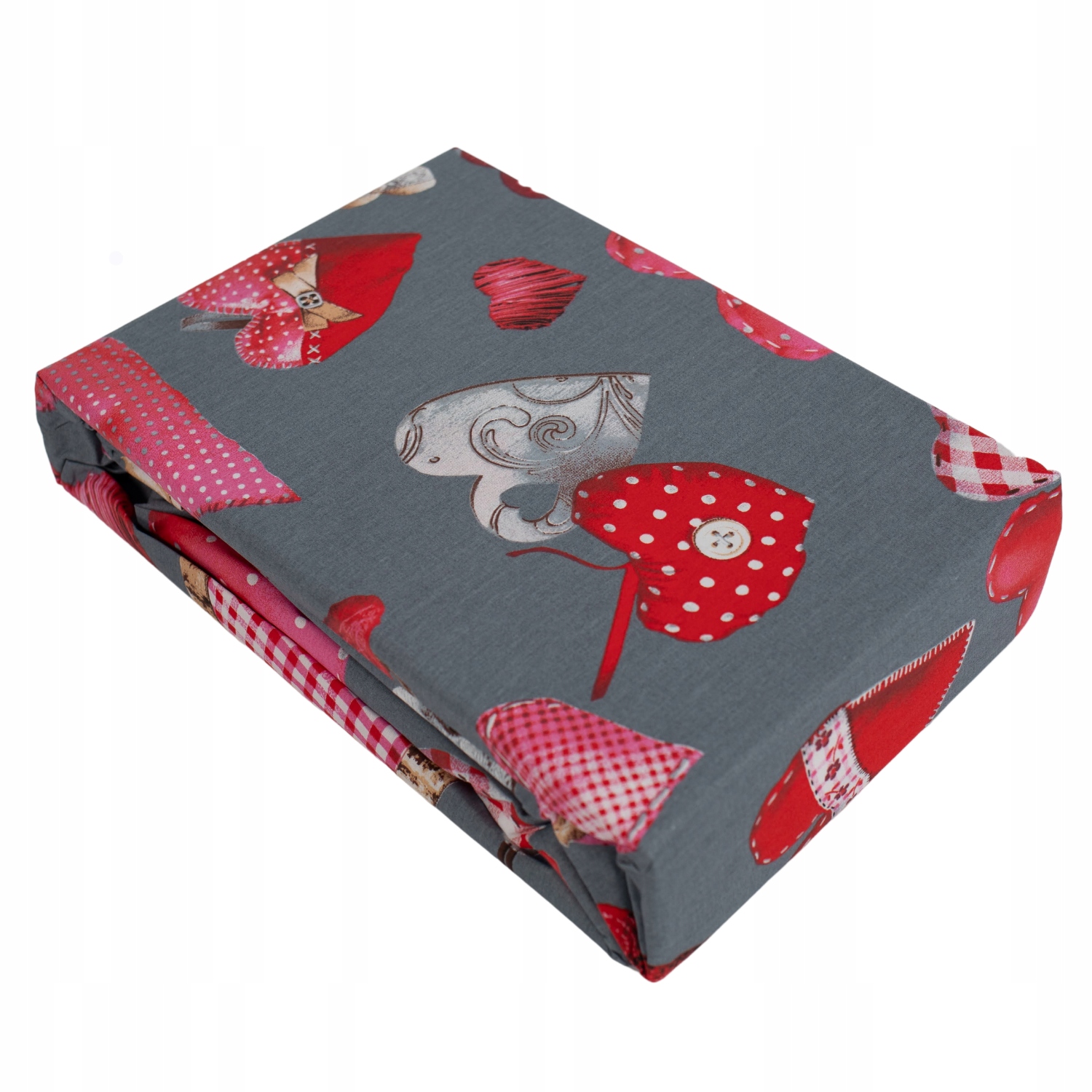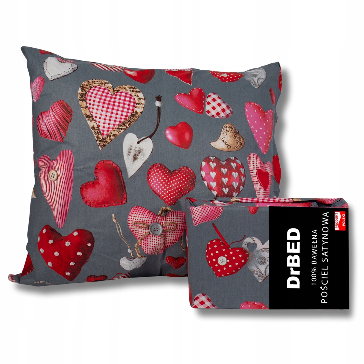 čar romantičnih src z modernim grafitnim ozadjem, kar ustvarja edinstven vizualni učinek . Podrobnosti, kot so vzorci karo, gumbi in različne oblike src, ji dajejo prijeten in rustikalen značaj . ▶ 100 % bombaž – vaš ključ do udobnega spanca