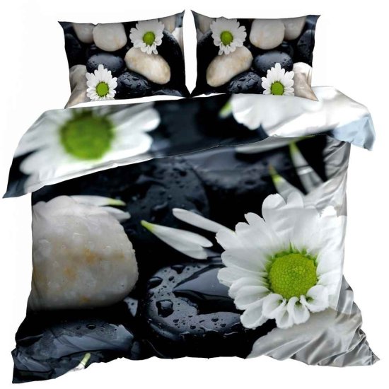 Posteljnina s podobo belih korejskih DEKLET z zelenimi sredicami, razporejenih na mokrih kamnih.