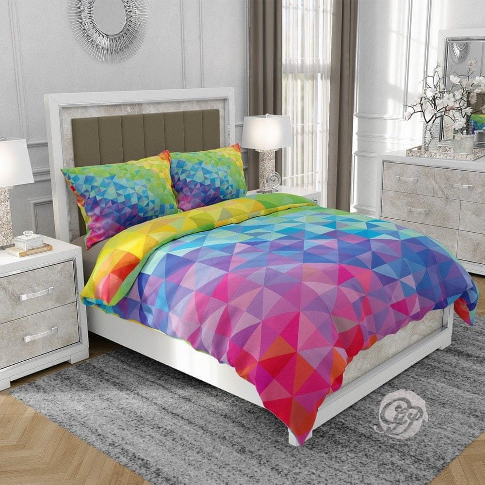 Barvita posteljnina, ki prikazuje vse barve mavrice v obliki tridimenzionalnih trikotnikov, kar daje učinek približnih pikslov.