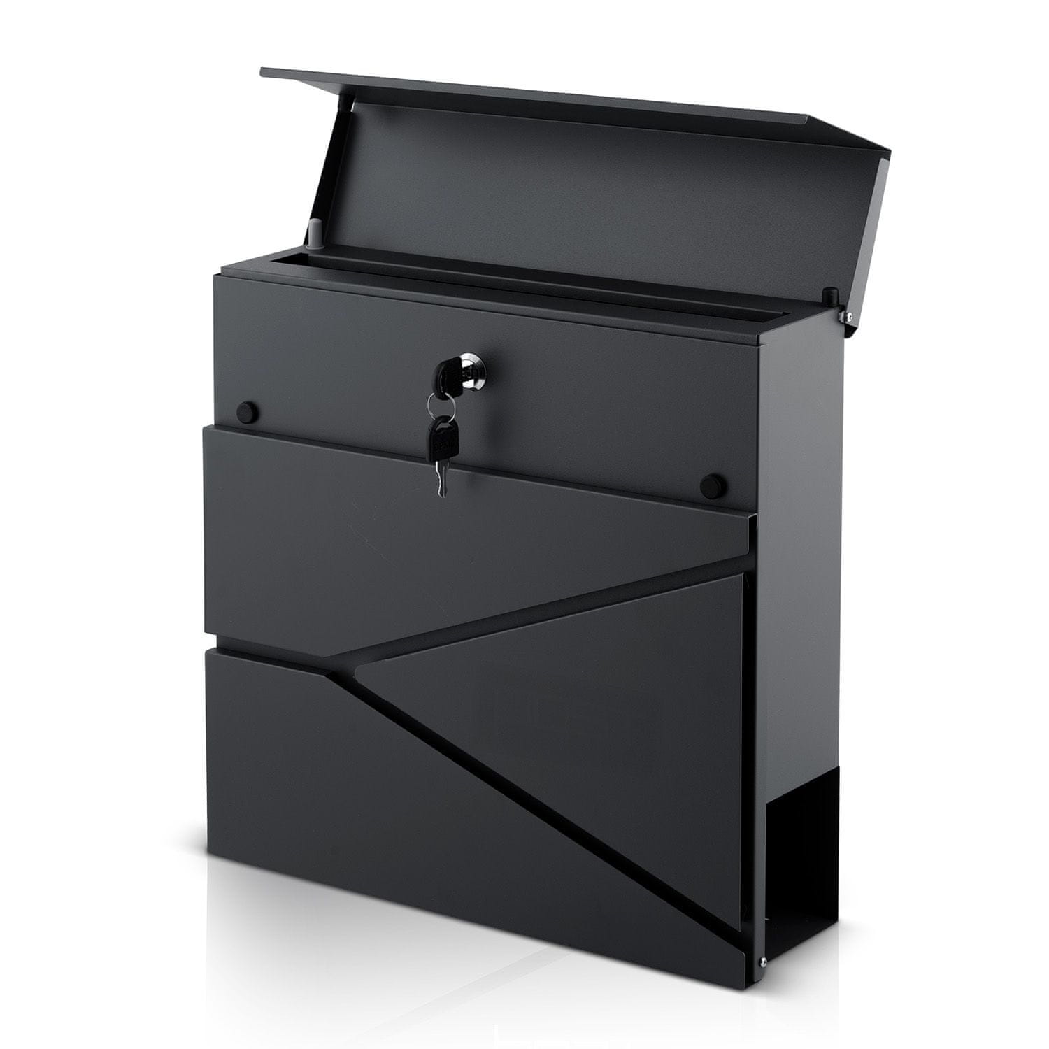 Material: Prašno barvano pocinkano jeklo Barva: antracit Vrsta vhoda: zgornji, z oblazinjenimi vrati Držalo za časopis Vključuje: 2 ključa, komplet za montažo Dimenzije: 37 × 37 × 11 cm