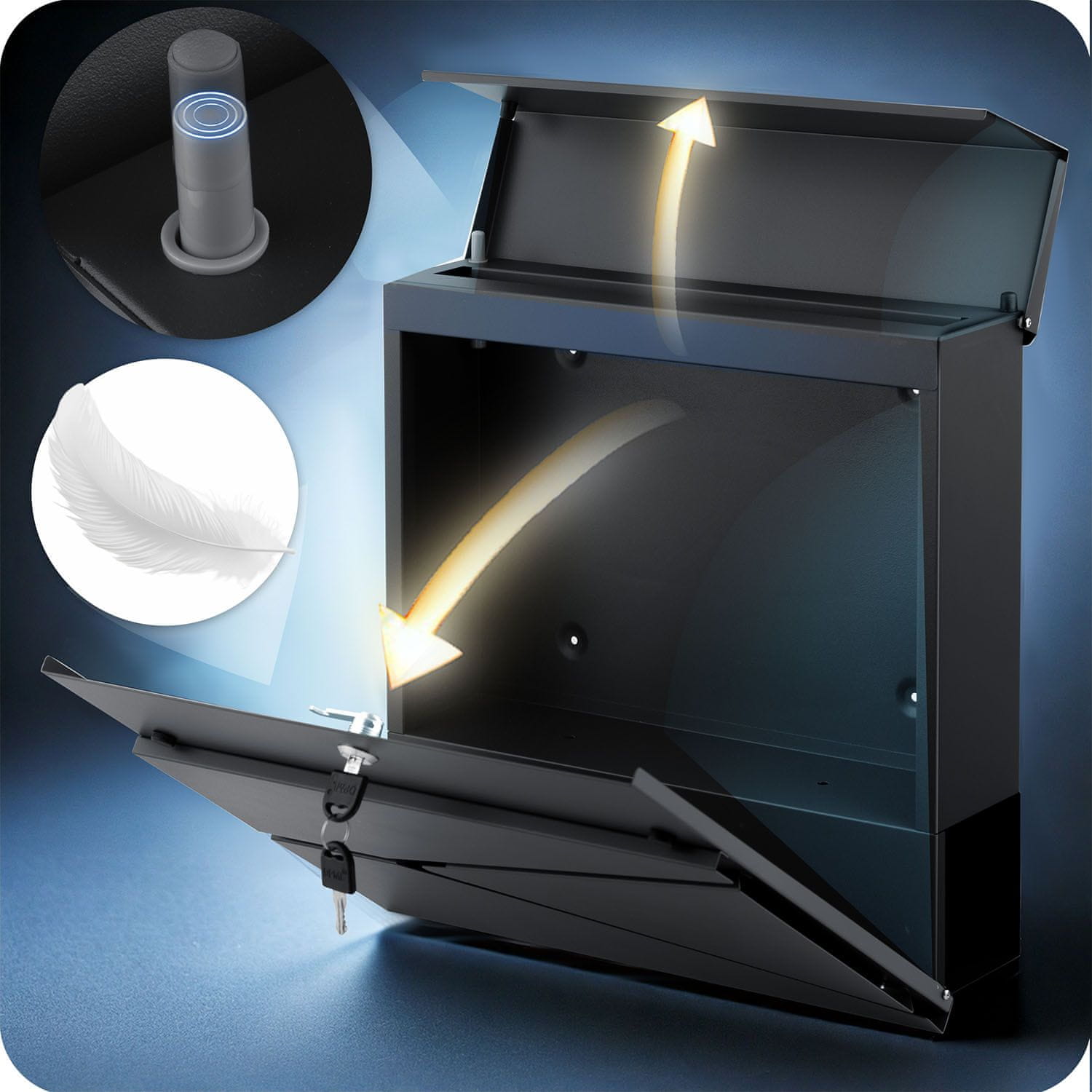 Opremljen s ključavnico z dvema ključema za večjo priročnost in lažji dostop. Zgornja spustna reža z oblazinjenimi vrati se zapre tiho in gladko, brez loputanja.