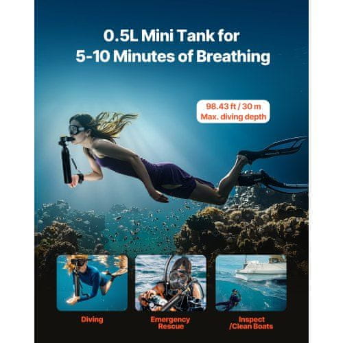 Ta prenosni potapljaški jeklenka s prostornino 0,5L omogoča 5–10 minut dihanja pod vodo, kar jo naredi idealno za začetnike ali kot rezervni vir zraka. Trpežna in enostavna za polnjenje, je popolna za rekreativno potapljanje in podvodno raziskovanje. Dimenzije: 7,3×36,5 cm. Celoten opis
