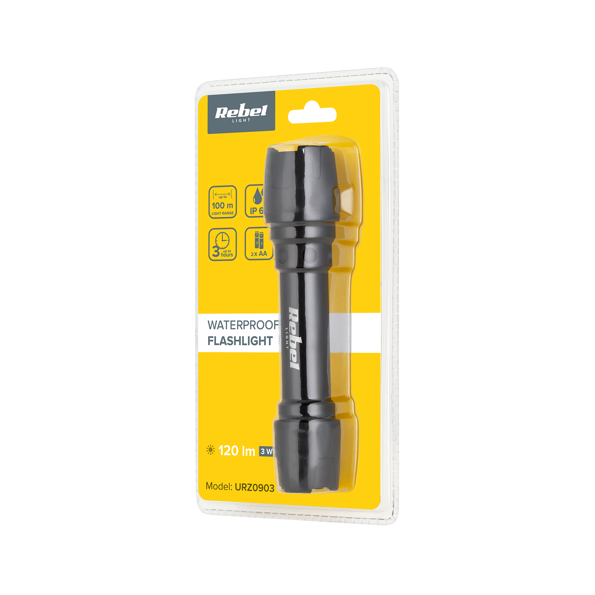 Svetilka, opremljena s 3 W LED, ustvarja svetlobni snop 120 lumnov svetlobe, ki zagotavlja svetlo in jasno osvetlitev na razdalji do 100 metrov. Do 3 ure delovanja z dvema baterijama AA (nista vključeni) omogoča dolgotrajno uporabo brez potrebe po pogostem polnjenju.