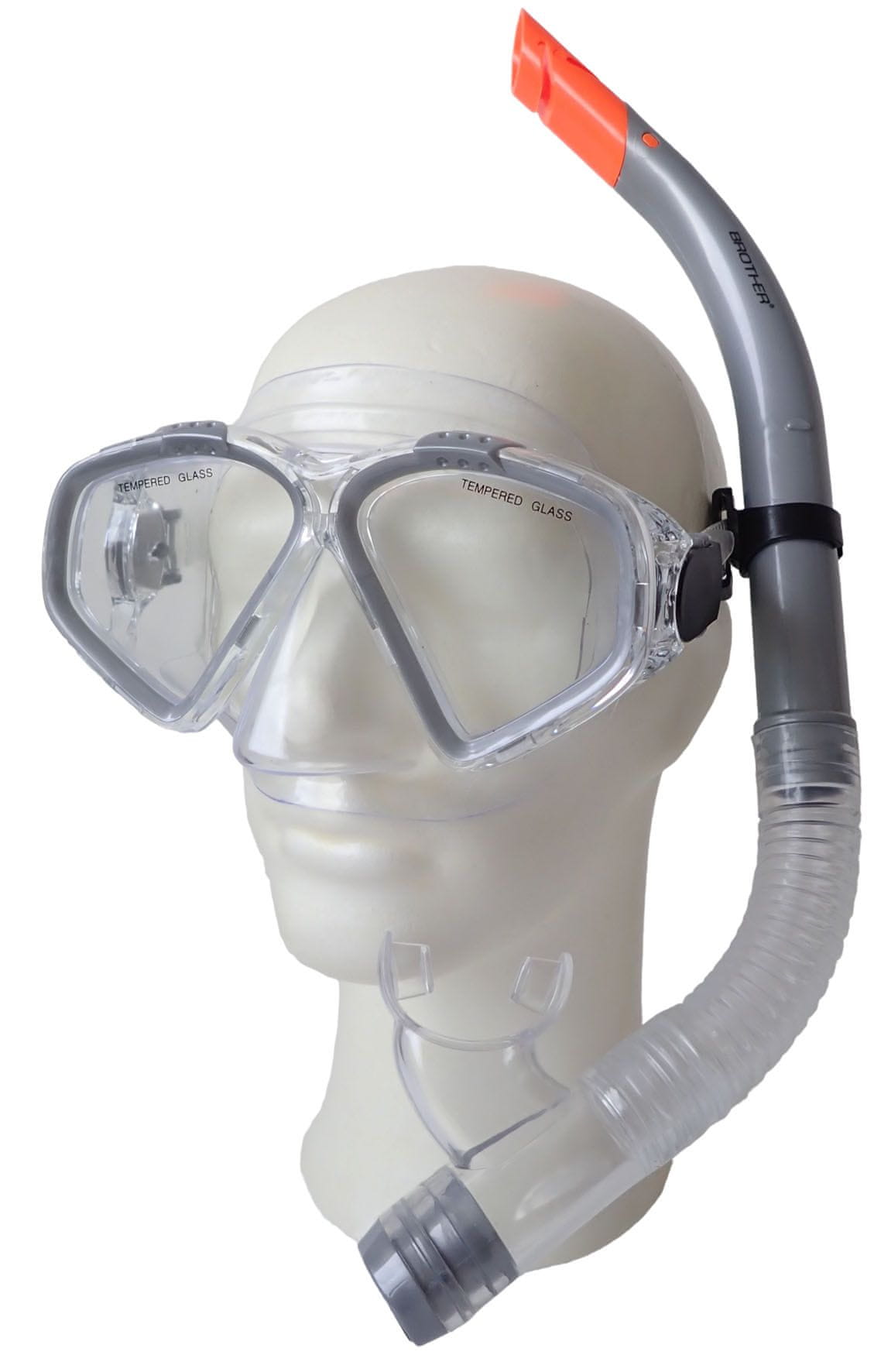 Potapljaški komplet BROTHER za odrasle – očala s kaljenim steklom, dihalka s pokrovom in izpuh. Poseben lepilni material očal zagotavlja zelo dobro zatesnitev očal. Pokrov na dihalki preprečuje vdihavanje vode med plavanjem na površini. Na voljo v sivi barvi.