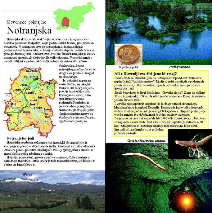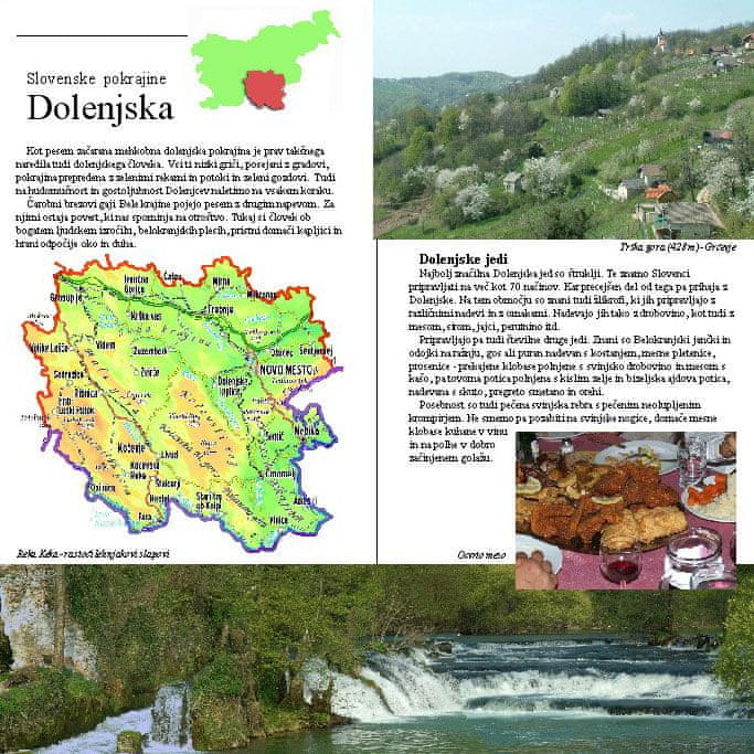 V knjigi je množica čudovitih fotografij, zemljevidov in informacij o skoraj vsakem slovenskem mestu. Knjiga se začne s splošnimi informacijami o zgodovini, kulturi, jeziku …, ki so predstavljene kot odgovori na pogosto zastavljena vprašanja. Nadaljuje se s predstavitvijo slovenskih geografskih pokrajin, lokalne kulinarike in znamenitosti. Vsaki slovenski pokrajini je namenjeno samostojno poglavje, ki z besedili, fotografijami in zemljevidi predstavi pokrajino, kraje, znamenitosti in druge zanimive informacije. Knjiga ne predstavlja zgolj naravnih lepot, temveč vse kar Sloveniji daje značaj in prepoznavnost.