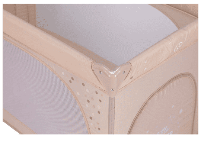 Mrežaste stranice zagotavljajo optimalno kroženje zraka in neoviran pogled na vašega malčka, na bočni strani prenosne postelje pa je odprtina z zadrgo, ki olajša prehod otroka v posteljo ali iz nje, saj ga pri tem ni potrebno dvigovati. Premikanje postelje po prostoru vam olajšata dve kolesi z zavoro.
