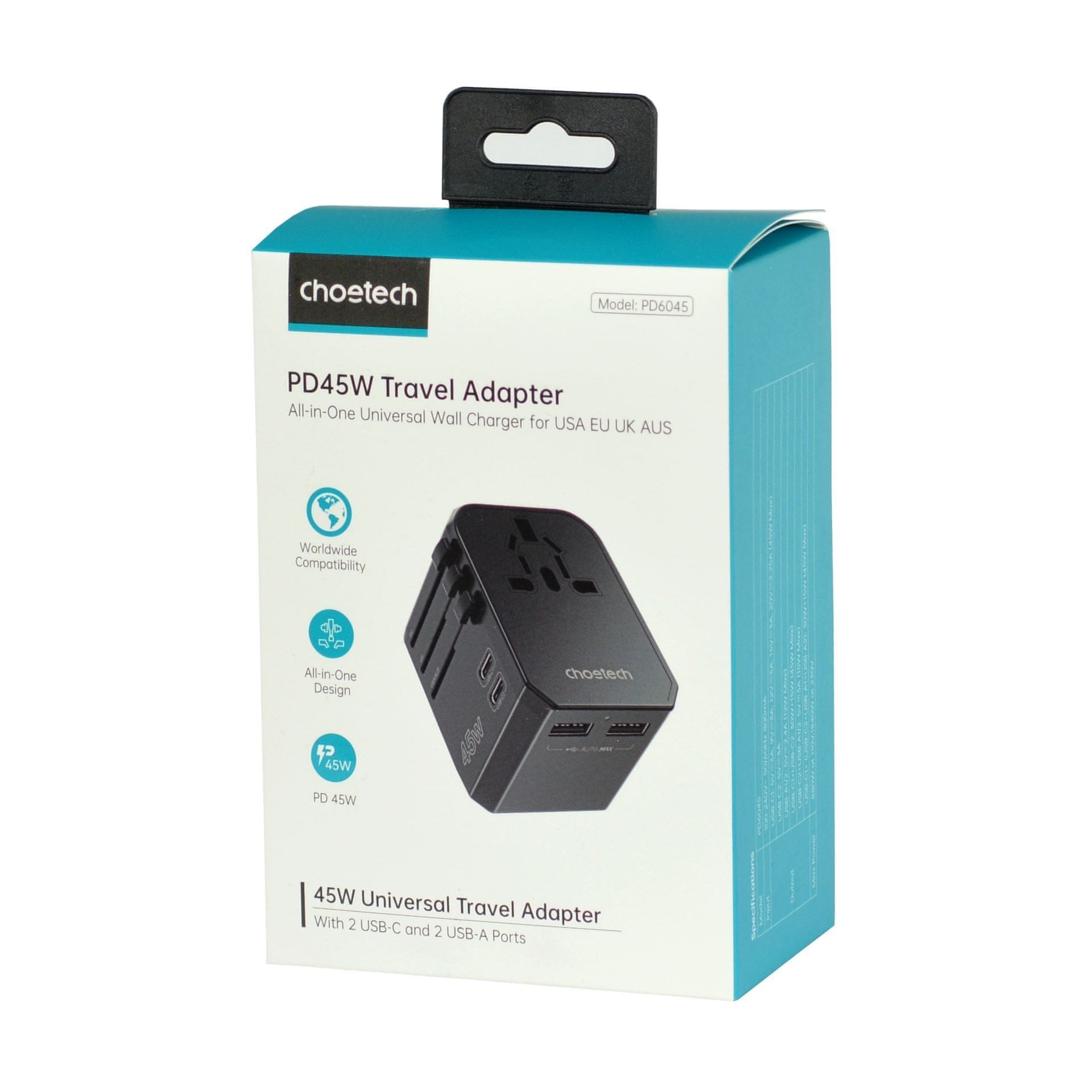 Potovalni adapter Choetech PD6045 je vsestranski adapter, ki omogoča povezavo z različnimi vrstami vtičnic po svetu, ob enem pa deluje pa tudi kot učinkovit polnilec s štirimi izhodi USB TipC in TipA do 45W.