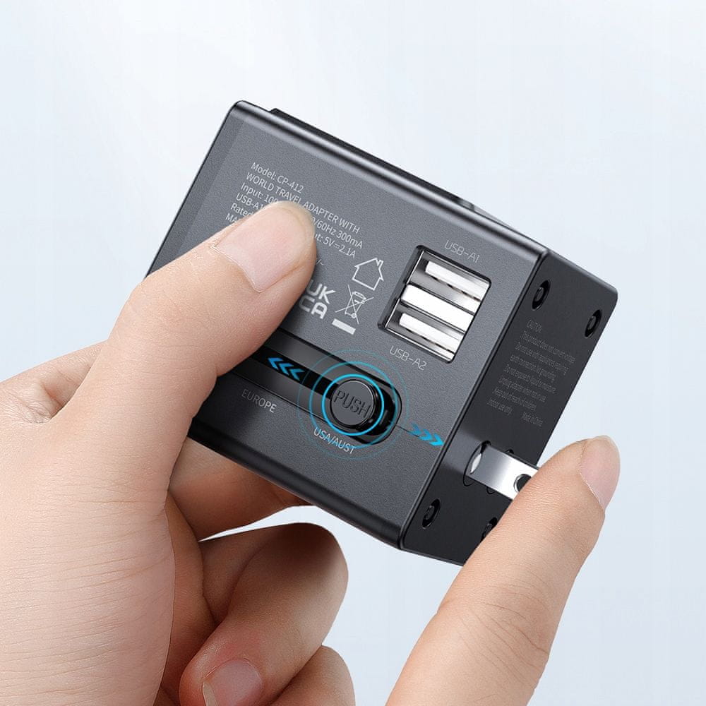 Priključite svoje naprave katerega koli standarda v katero koli vtičnico na svetu ali priročno uporabite 2 vtiča USB za polnjenje, vse v eni sami majhni kocki.