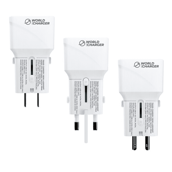 Adapter je primeren za različne svetovne vtičnice 220V (EU, UK, US, AUS/CN vtič). Z drsnikom izberete vtičnico, ki jo potrebujete in nato napolnite napravo preko izhoda USB A ali Type C.