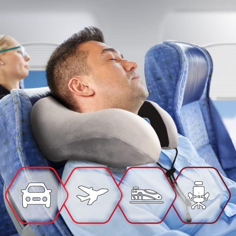 Ta potovalna blazina za vrat v obliki polmeseca ni le udobna, ampak tudi funkcionalna. Polnjen s spominsko peno se popolnoma prilagaja obliki telesa uporabnika in profilu vratu. Tako boste ohranili pravilen in udoben položaj glave in vratu ter vas ob prebujanju ne bo neprijetno presenetil boleč vrat. Za zagotovitev udobnega počitka uporabniku tudi na trdi podlagi je bila uporabljena dodatna pena za večjo mehkobo blazine.