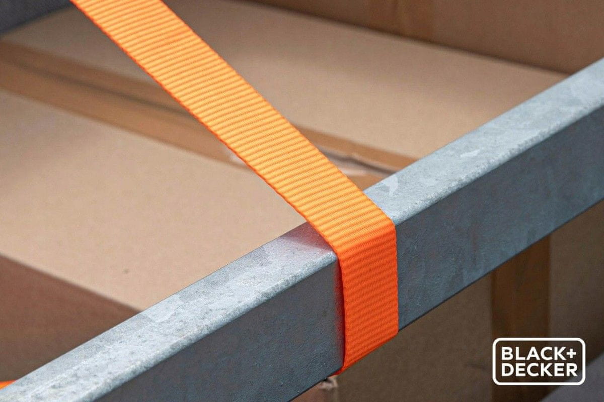 Za varen transport vaših dragocenosti je tu zatezni trak BLACK+DECKER dolžine 5 m, z ragljo. Izdelan iz trpežnega najlona, dopolnjuje pa ga nosilnost do 350 kg, zato zagotavlja močno in zanesljivo pritrditev.
