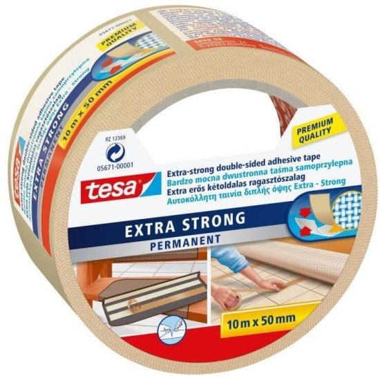• Tesa ekstra močan lepilni trak za preproge 10 m x 50 mm – 1 rola.