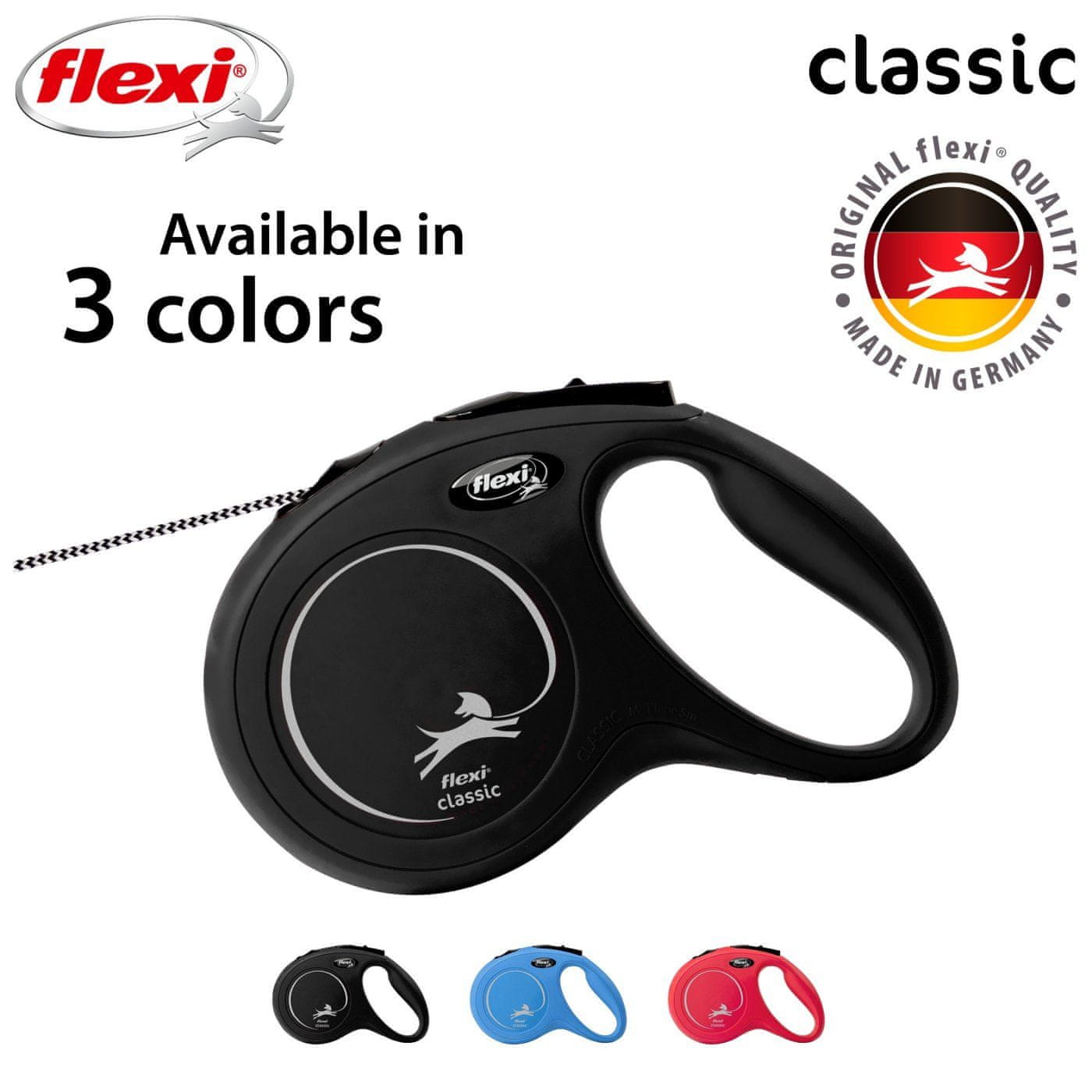 Povodci flexi Classic ponujajo udoben oprijem, vzdržljiv sistem navijanja ter kakovosten, varen in intuitiven zavorni sistem, ki v delčku sekunde ustavi gibanje psa. Za enostavno pritrditev na ovratnico ali pasjo opravo je povodec opremljen s kromirano karabinko.