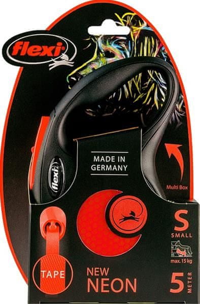New Neon je odličen povodec, ki zaradi odsevnih nalepk in elementov neonske barve izstopa v vseh vremenskih razmerah. Odsevne nalepke odbijajo žaromete na razdalji več kot 150 m. Zaradi neonsko obarvanih elementov ste bolj vidni in varnejši! Vi in vaš pes spadate v eno ekipo! Ljudje vas lahko vidijo že od daleč. Izboljšani zavorni sistem s kratkim hodom omogoča boljši nadzor. Dodate lahko večnamensko škatlo za shranjevanje priboljškov ali vrečk (od velikosti S). Družinsko podjetje flexi proizvaja izključno v Nemčiji. Vse, od zasnove do proizvodnje visokokakovostnih povodcev, je narejeno v tovarni v Bargteheidu pri Hamburgu – Made in Germany. Podjetje Flexi je izumitelj samonavijalnega povodca in vodilno podjetje na svetovnem trgu, ki izvaža v več kot 90 držav. za izvirne samonavijalne povodce podjetja Flexi sta značilna patentiran, tehnično najsodobnejši sistem vzmeti in udobno upravljanje. Izdelani so iz visokokakovostnih materialov, izključno ročno izdelani in sestavljeni. Velikost: S – primeren za pse, težke do 15 kg. vrsta povodca: zložljiv – pas. dolžina pasu/povezave: 5 m barva: oranžna