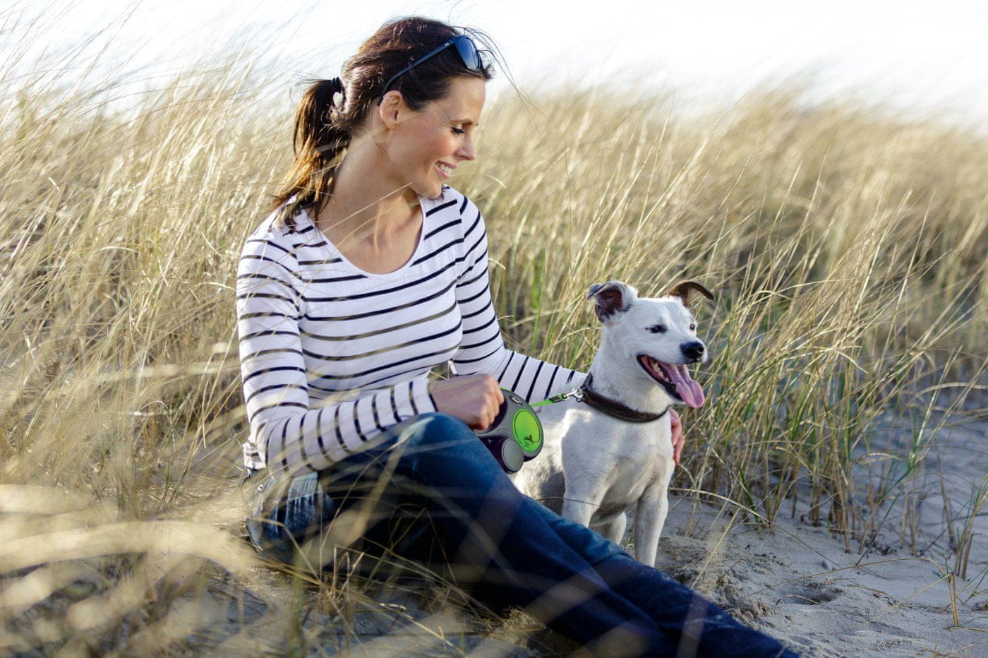 Samonavijalni povodec flexi ne bo nikoli obvisel. Tako lahko psa kadar koli ustavite s pritiskom na zavorni gumb, varno nadzorujete svojega psa in ga približate sebi.
