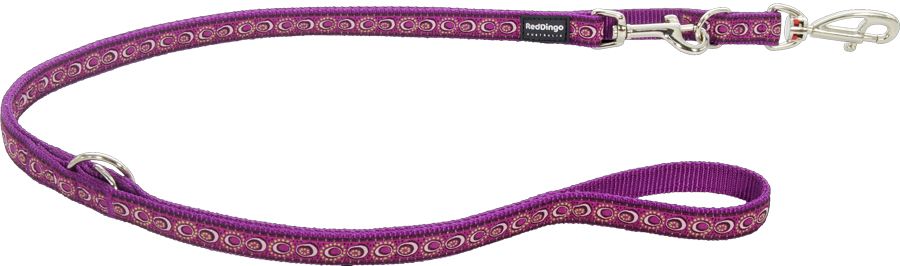 Eleganten preklopni povodec za psa Red Dingo vijolične barve z vzorcem COSMOS. Preklopna vrvica ima dolžino 2,0 m in je zaključena z visokokakovostnimi karabini, dovolj močnimi za debelino vrvice, z edinstvenim dizajnom na obeh koncih. Celoten opis