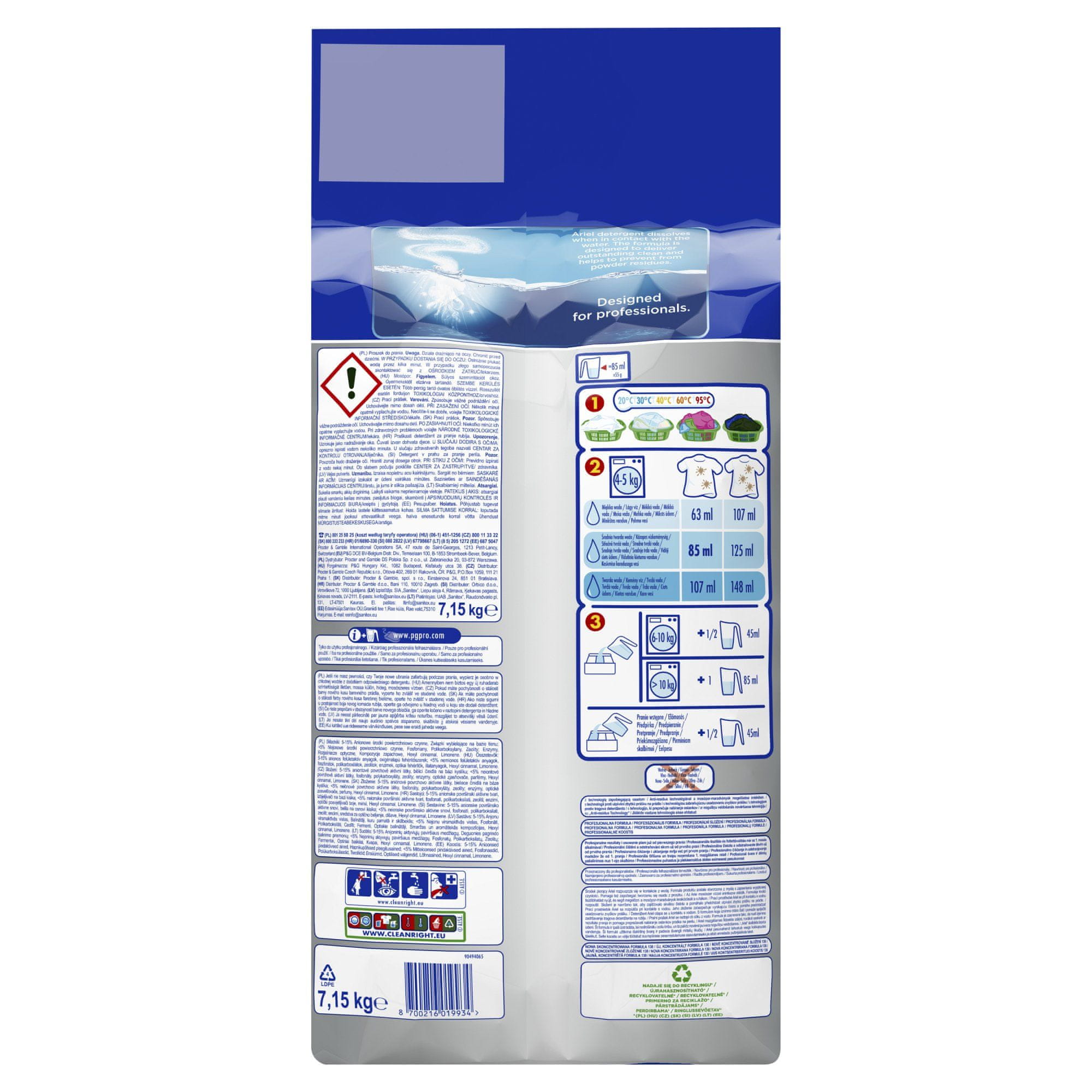Detergent Ariel Professional Regular odstranjuje madeže in čisti že ob prvem pranju. Odlične rezultate doseže tudi pri pranju v hladni vodi. Sestava detergenta za profesionalno uporabo. Celoten opis
