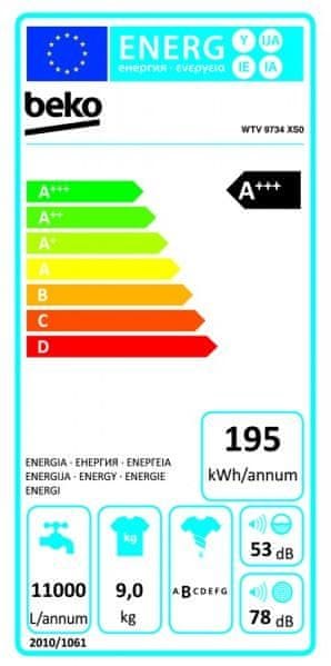 Beko WTV9734XS0 pralni stroj s sprednjim polnjenjem se ponaša z izjemno nizko porabo energije, saj deluje v energijskem razredu A+++. Njegova zmogljivost pranja je 9 kilogramov. Pri ožemanju doseže hitrost do 1400 obratov v minuti.