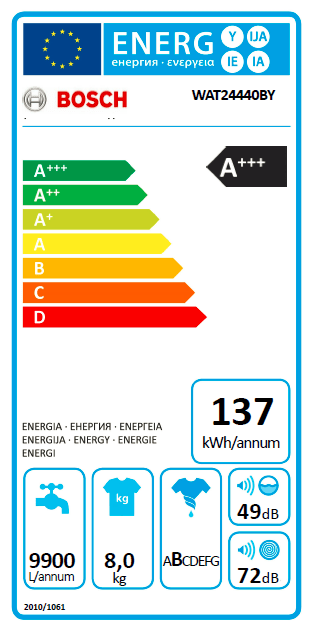 Bosch WAT24440BY pralni stroj energijskega razreda A+++ se ponaša z zmogljivostjo 8 kilogramov, pri ožemanju pa doseže hitrost do 1200 obratov v minuti. Ponaša se z EcoSilence Drive motorjem, ki zagotavlja vrhunsko tiho delovanje ob izjemni vzdržljivosti. Na voljo je VarioPerfect nabor časovno ali energijsko optimiranih programov, ki poskrbi za najboljše rezultate pranja pri vseh vrstah tkanin in količinah perila. Prednost pralnega stroja je program čiščenja bobna s funkcijo opomnika, ki poskrbi za čiščenje in vzdrževanje bobna.