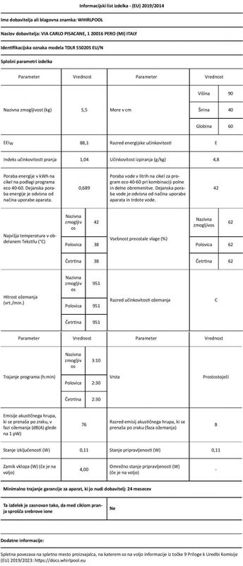 Prostostoječi pralni stroj z zgornjim polnjenjem se s svojim varčnim delovanjem uvršča v energijski razred E. Ponaša se z zmogljivostjo pranja do 5,5 kg perila in s 14 programi pranja. Whirlpool TDLR 55020S EU/N ima velik zaslon, funkcijo preloženega začetka ter nežno in tiho odpiranje vrat bobna pralnega stroja. Celoten opis